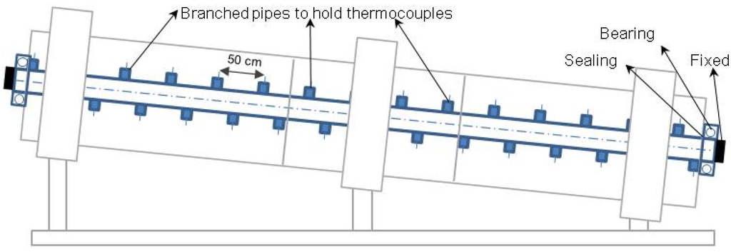 To position thermocouples inside the rotary gasifier is a great challenge. Calibrated S-type (platinum-rhodium) thermocouples are used for temperature measurement. The wires are electrically separated from each other by ceramic beads. All the electric wires are placed inside a 1Cr18Ni9Ti stainless steel pipe coated with insulation layer. The pipe is fixed at the center axis of the reactor with two bearings at both ends to ensure an immobile position when the reactor is rotating (Figure 4). A digital data collector is used to read out the temperature.