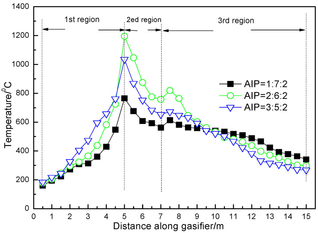 Besides λ, AIP also plays an important role on the temperature profile inside the gasifier. According to the description of the conceptual design, the purpose of the three air injections is not identical. The first air is to supply the heat required for the pyrolysis reactions; the secondary air is used for partial oxidation of the pyrolytic gas, which results in a high temperature environment; the third air acts as an agent for char gasification. Hence, optimization of AIP is crucial for acquiring a desired temperature distribution.
