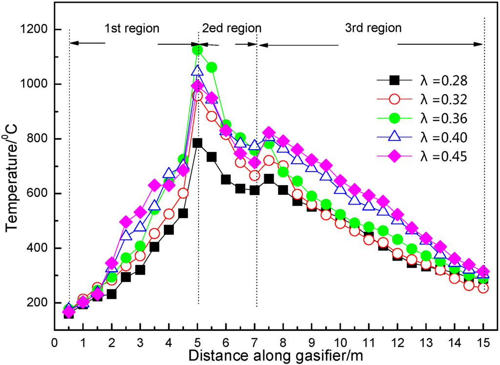 The steep growth at the inlet of second region can be attributed to severe combustion of the pyrolytic gas. As shown in Figure 6, when λ increased from 0.28 to 0.36, the peak temperature rose from 965 to 1196 °C. It is obvious that a higher λ promoted partial oxidation reactions, and hence released more heat to this region. The temperature didn′t vary linearly with λ. When λ increased from 0.36 to 0.45, the temperature decreased from 1196 to 1124 °C. This is because that under higher λ conditions, biomass pyrolysis is already finished. Increased air injection will dilute the pyrolytic gas since a large amount of N2 is injected into the system. Therefore, the partial oxidation rate of the pyrolytic gas is slowed down and the temperature of the second region decreased accordingly.