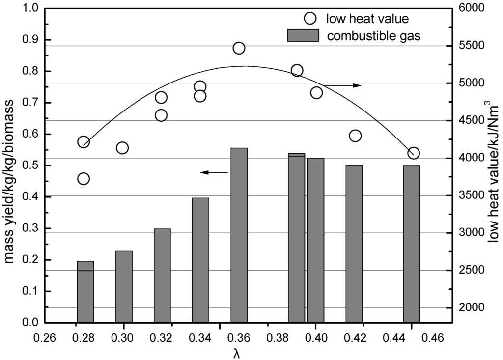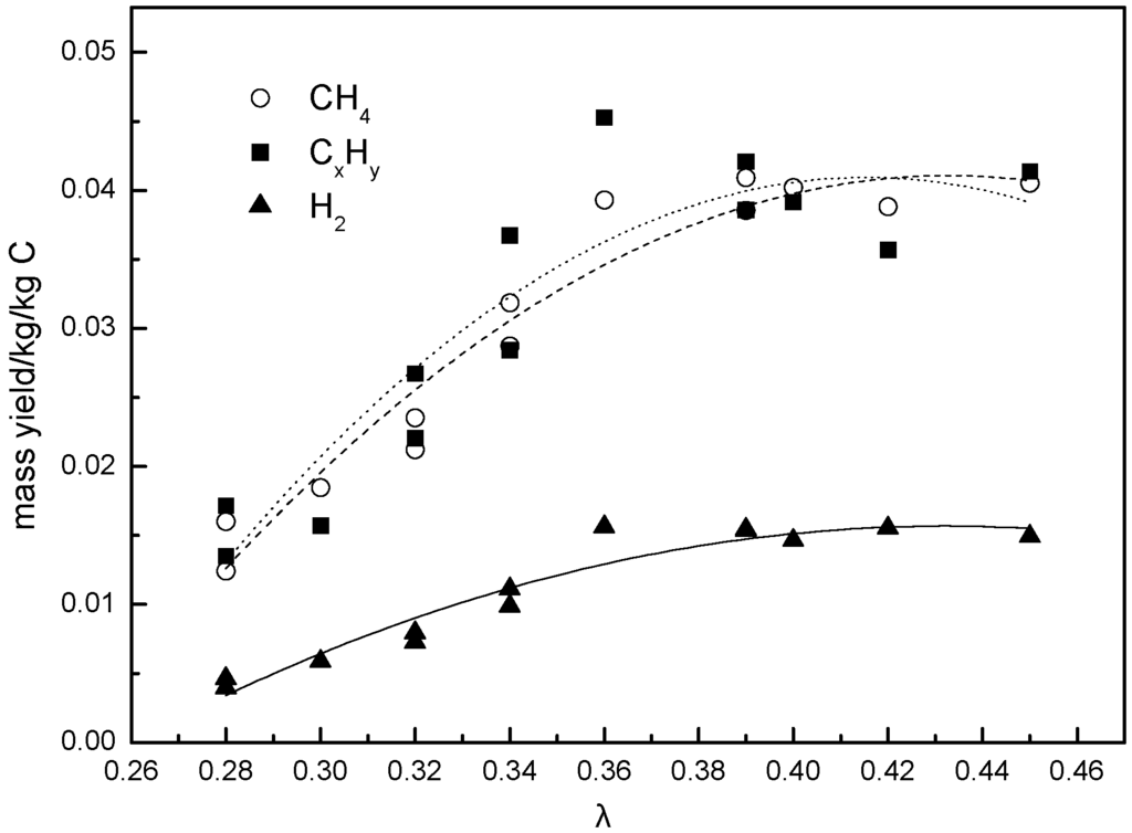 CH4 and CxHy are shown in Figure 8. The formation of CH4 is always considered to be the product of demethylation reactions. Therefore, the amount of methyls in the biomass structure and the environmental temperature would be important for CH4 production. The peak values of CH4 and CxHy were 0.074 kg/kg C and 0.085 kg/kg C at the point of λ = 0.36.