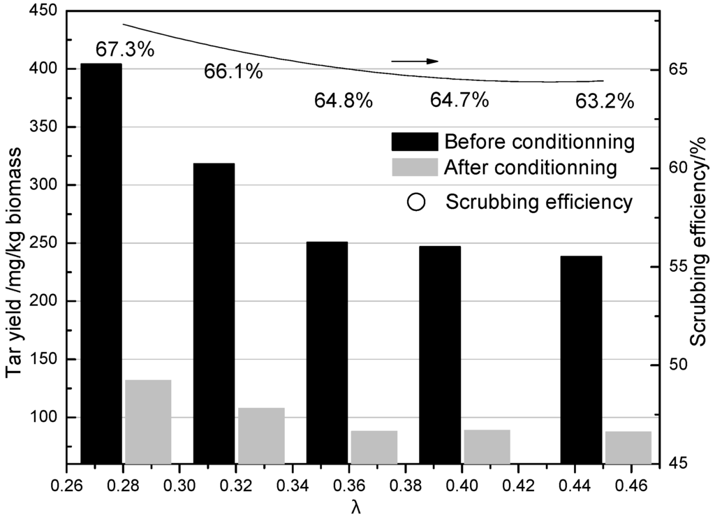 Figure 10 also shows that tar yield obviously decreased after the gas conditioning process. Although the scrubbing efficiency slightly decreased as the input tar concentration was reduced, the average efficiency could be kept at around 65%. This indicated that the gas conditioning system has good load regulation ability.