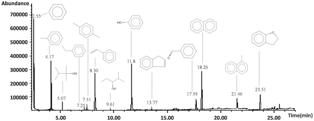 Tar composition is analyzed by gas chromatography/mass spectrometry (GC/MS) using an Agilent 6890 N gas chromatograph and an Agilent 5975 C mass spectrometer (Agilent, Santa Clara, CA, USA). The GC split ratio is 10:1. The sample inlet temperature is set at 280 °C. A HP-5MS column (30 m × 0.25 mm, 0.25 μm) is used at a flow rate of 2.4 mL/min. The carrier gas is helium with a flow rate of 30 mL/min. The column temperature increases from 45 to 180 °C at 5 °C/min and then to 300 °C at 45 °C/min, where it is held for 10 min. The sample injection volume is 1 μL. The GC/MS was quantified by the external standard method with 2, 5, 10, 20, 40, 60, 80 and 100 ppm solutions of eight typical tar components: benzene, toluene, styrene, phenol, naphthalene, ethylbenzene, indene, and benzaldehyde. The chromatographic system has limitations for measuring higher tars as the heavier components are retained and do not elute through the GC column [7].