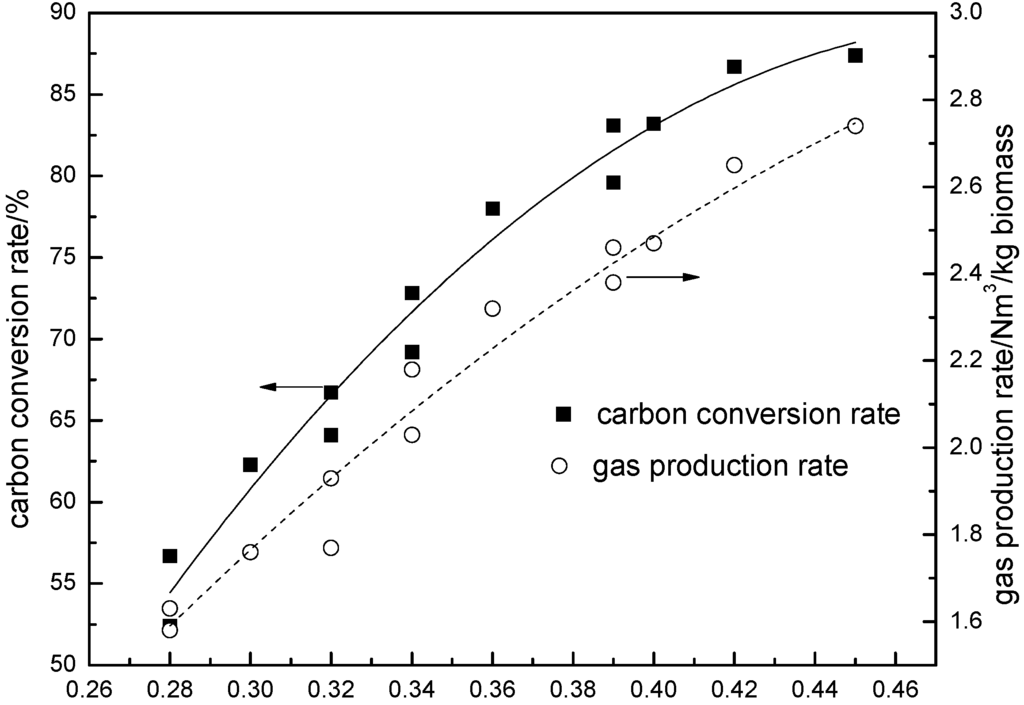 During the biomass thermal chemical conversion process, the production of CO2 is always accompanied by CO release. It seems that there is a rivalry between the formation of CO and CO2. The proportion of CO and CO2 is determined by the temperature and oxygen concentration in the environment. When the temperature was low, an increase of λ resulted in production of CO, while, CO2 might be favored under a high temperature environment. Looking at the CO/CO2 value in Figure 7, it is clear that when λ is below 0.36, the temperature is not high enough to initiate homogeneous oxidation. That is kinetically control reaction, thus CO keeps increasing as a result of the promoted pyrolysis reaction. Meanwhile, as λ surpasses 0.36, a significant increase of temperature in the second stage could be observed in Figure 6. Hence, CO would be oxidized into CO2 and lead to a decrease of CO/CO2. Under this condition, it seems that the diffusion rate dominates the oxidation reaction.