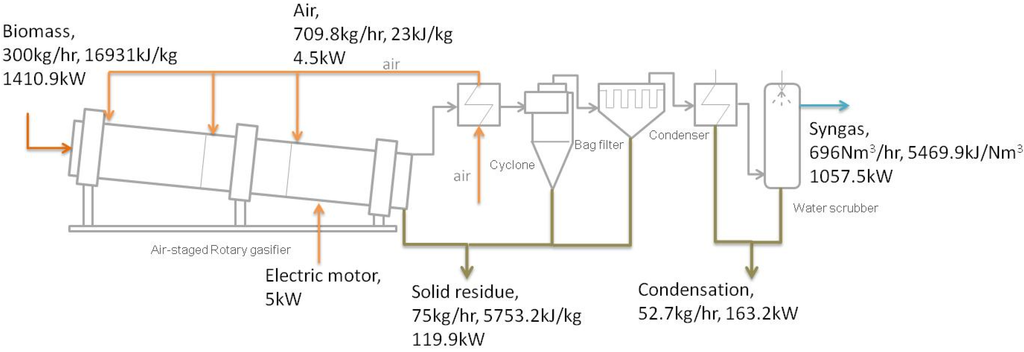 Figure 14 shows the schematic diagram of the system with the energy input and output of products at each stage. Total energy input was determined by biomass feeding rate, total air injection and motor power. In the present test, the energy input was 1420.4 kW. The syngas energy was 1057.5 kW, so the energy conversion efficiency is 74.45%. This was due to heat losses from the system and also the heat reserved in the char residue. Besides, some of the energy is also lost in the gas conditioning system through the scrubbing and condensation processes. The characteristics of the solid residue are listed in Table 3.