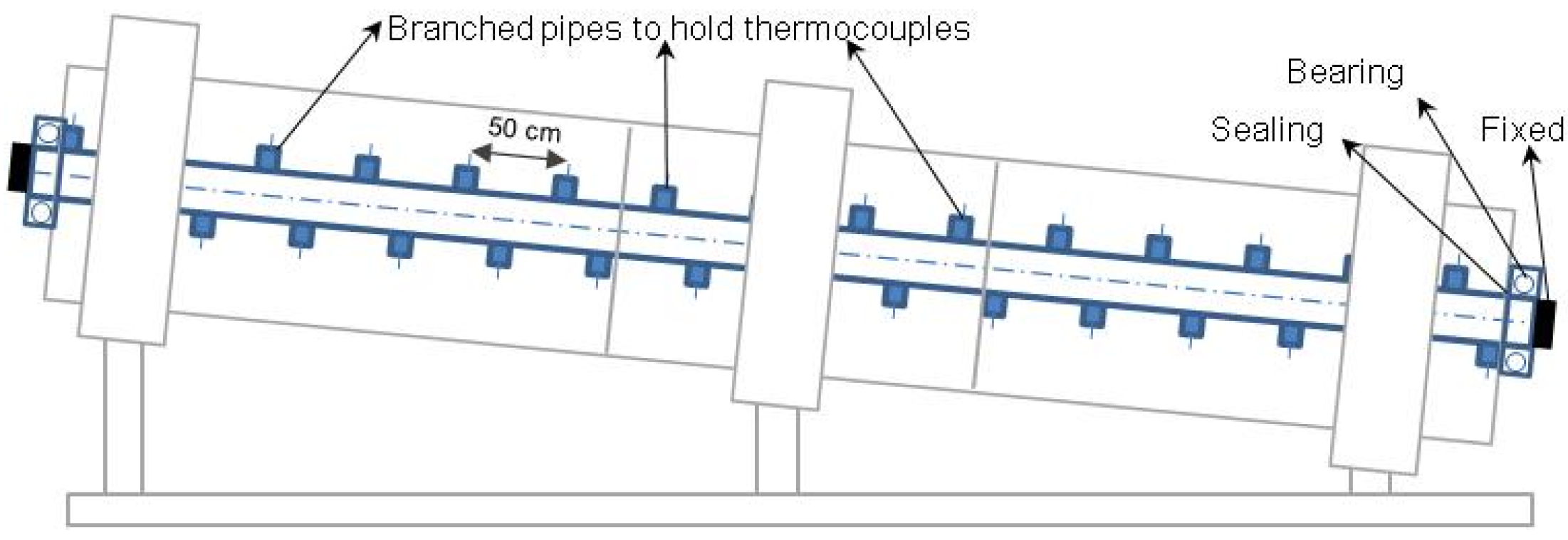 Figure 1. The gasifier is a rotary kiln with a 6 degree angle of inclination. Unlike a traditional rotary kiln, it is divided into three regions, which are oxidative degradation, partial oxidation and char gasification. Biomass is fed into the reactor from the left end and passes through the gasifier by rotating the reactor. Air used for gasification is injected into three different regions by a blower.