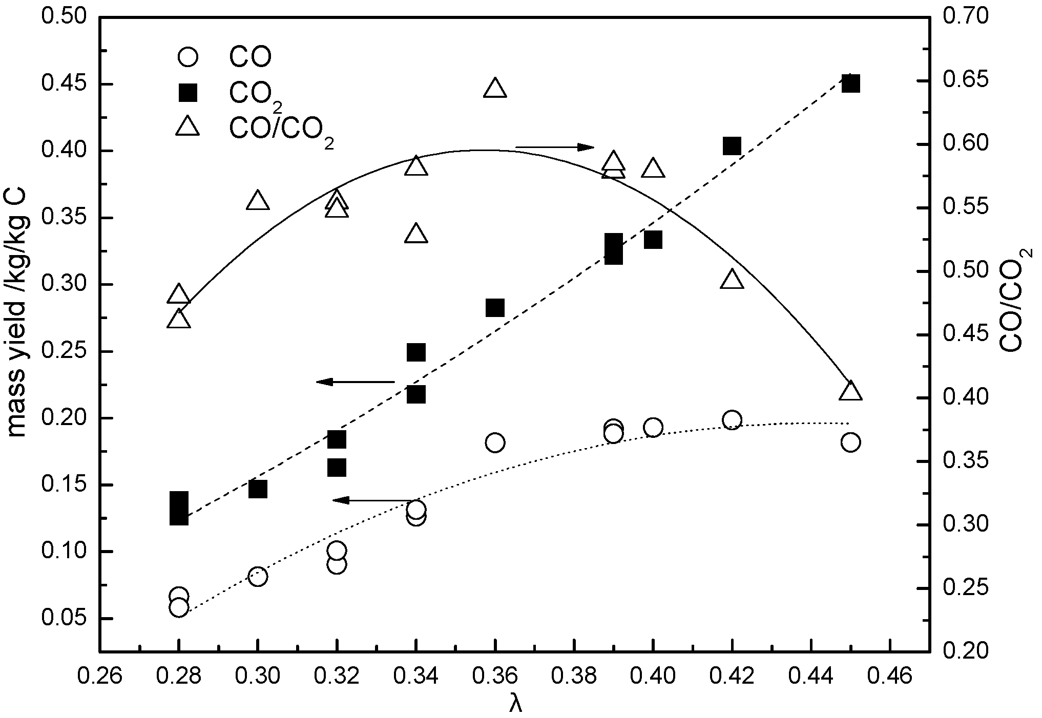 CO first increased then decreased as λ increased. As λ increased from 0.28 to 0.42, the yield of CO increased from 0.125 to 0.373 kg/kg C. After that, CO decreased to 0.341 kg/kg C. However, the mass yield of CO2 continuously increases with λ. The mass of CO2 is always larger than that of CO for all conditions.