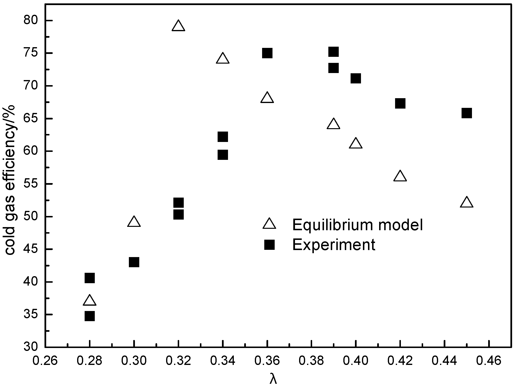Figure 13. The theoretical thermodynamic equilibrium calculations based on Gibbs free energy minimization is chosen to model the biomass gasification process. For the equilibrium calculations, the software program FactSage 5.4.1 has been used. FactSage is an integrated thermochemical databank system consisting of calculation modules and databases. It enables the user to access and manipulate pure substance and solution databases and perform thermochemical calculations such as multiphase chemical equilibria. It was seen that under equilibrium conditions there is a general increase in the cold gas efficiency with λ. The maximum value of 79% was obtained at λ = 0.32. This peak value is higher than the operational results and occurs at a lower λ. The highest cold gas efficiency of 75% can be achieved when λ was 0.36 under the operation conditions. Since the equilibrium model assumes an isothermal and long enough residence time to achieve equilibrium, the error may be attributed to the non-isothermal temperature inside the gasifier and the short residence time.