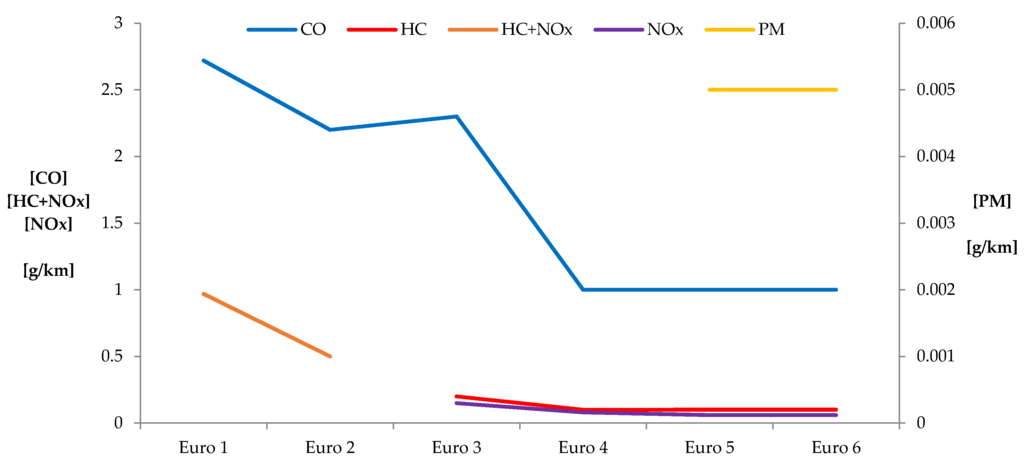 The Euro emission standards for the regulated pollutants for petrol passenger cars (based on [16]).