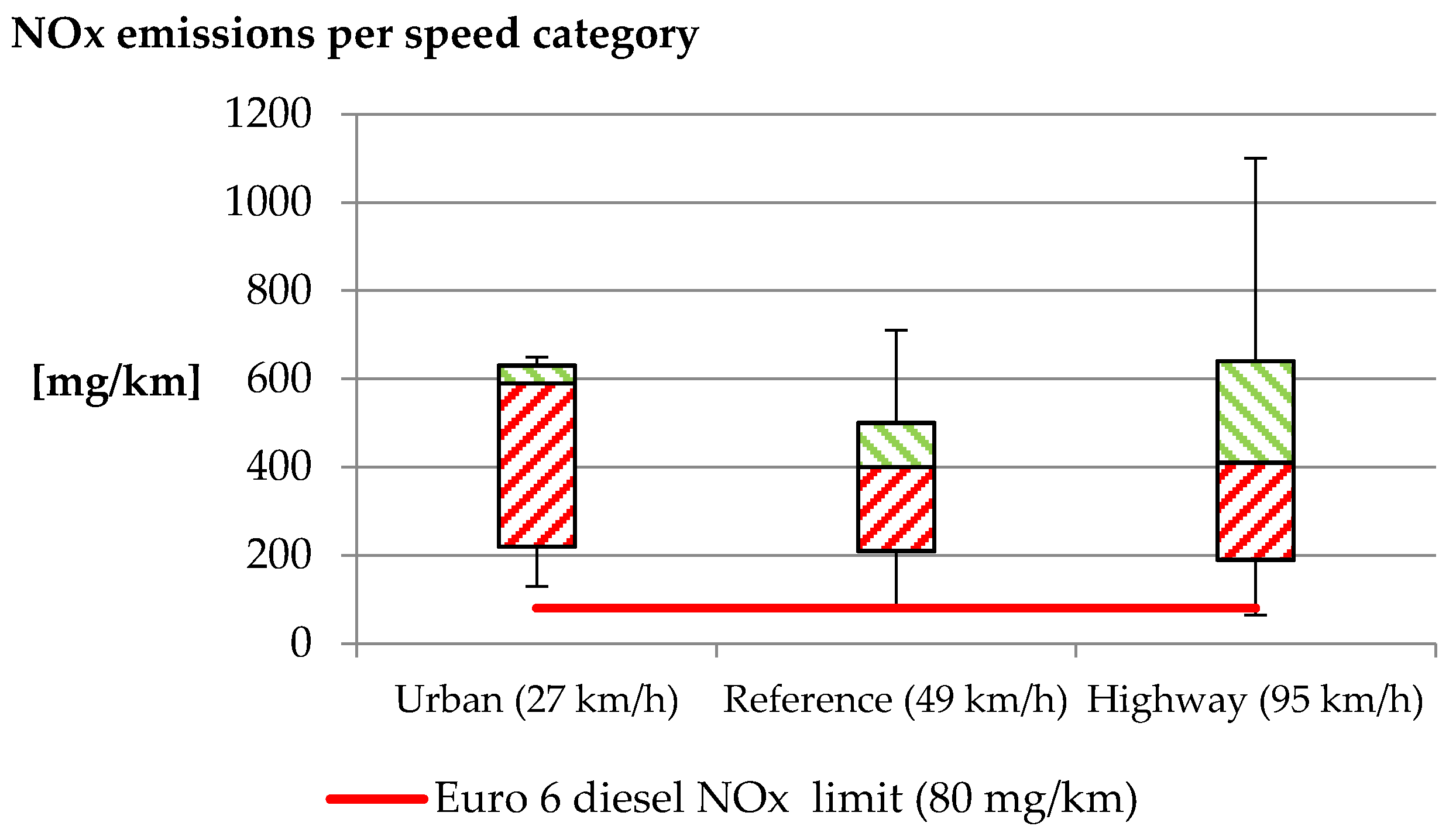 On-road NOx emission boxplot results for Euro 6 diesel passenger cars according to speed category (based on [42]). Important for this article are the NOx emissions at urban speeds, which range from 130 to 650 mg·km−1, despite the type-approval limit of 80 mg·km−1 for Euro 6 diesel cars.
