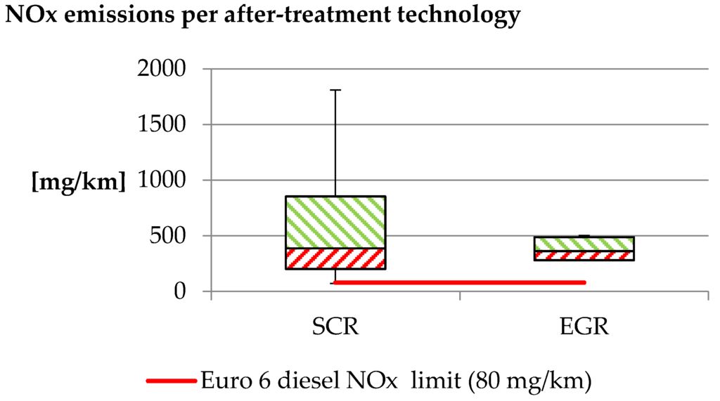 Figure 3 shows the large variabilities for the different test vehicles for urban, rural and highway trips, as they are presented by TNO. Of interest to the topic of this paper are the NOx emissions under urban conditions, ranging from approx. 130 to 650 mg·km−1 [42]. Figure 4 on the other hand plots the NOx averages in mg·km−1 for the vehicles tested by the ICCT. Notice from both Figure 3 and Figure 4 that certain vehicle models do comply with the regulations under real-world situations (i.e., tested on road by means of PEMS). This implies that compliance with the NOx regulation is feasible today.