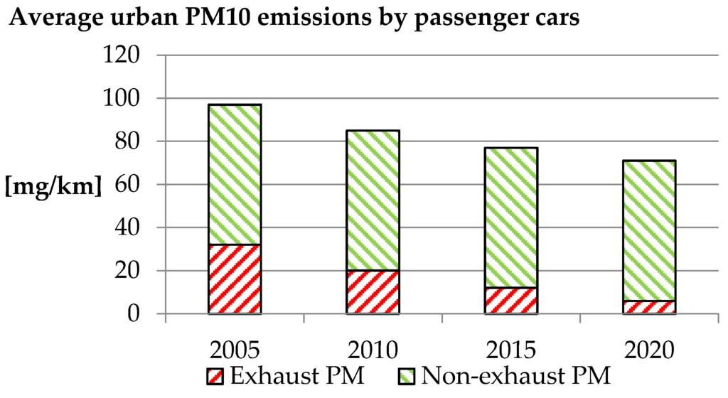 Concerning the influence of both exhausted and non-exhaust related PM, a forecast up to 2020 is given in Figure 5. The ratios for urban exhaust to non-exhaust PM diminish as one moves to the right of the graph. The reason for this is that the fleet turns over and the oldest (non-DPF) diesels get replaced. The growing dominance of non-exhaust PM is highlighted in this graph, as despite ongoing restrictions for the exhaust PM, a business-as-usual approach for non-exhaust PM will not allow to obtain significant reductions of the total traffic-related PM emission. As mentioned earlier, almost all exhausted PM can be found in the PM2.5 range, while for this paper this share is assumed to be 100%. Coarse particles (PM2.5–PM10) on the other hand, originate from non-exhaust sources such as brake, tyre and road surface wear.