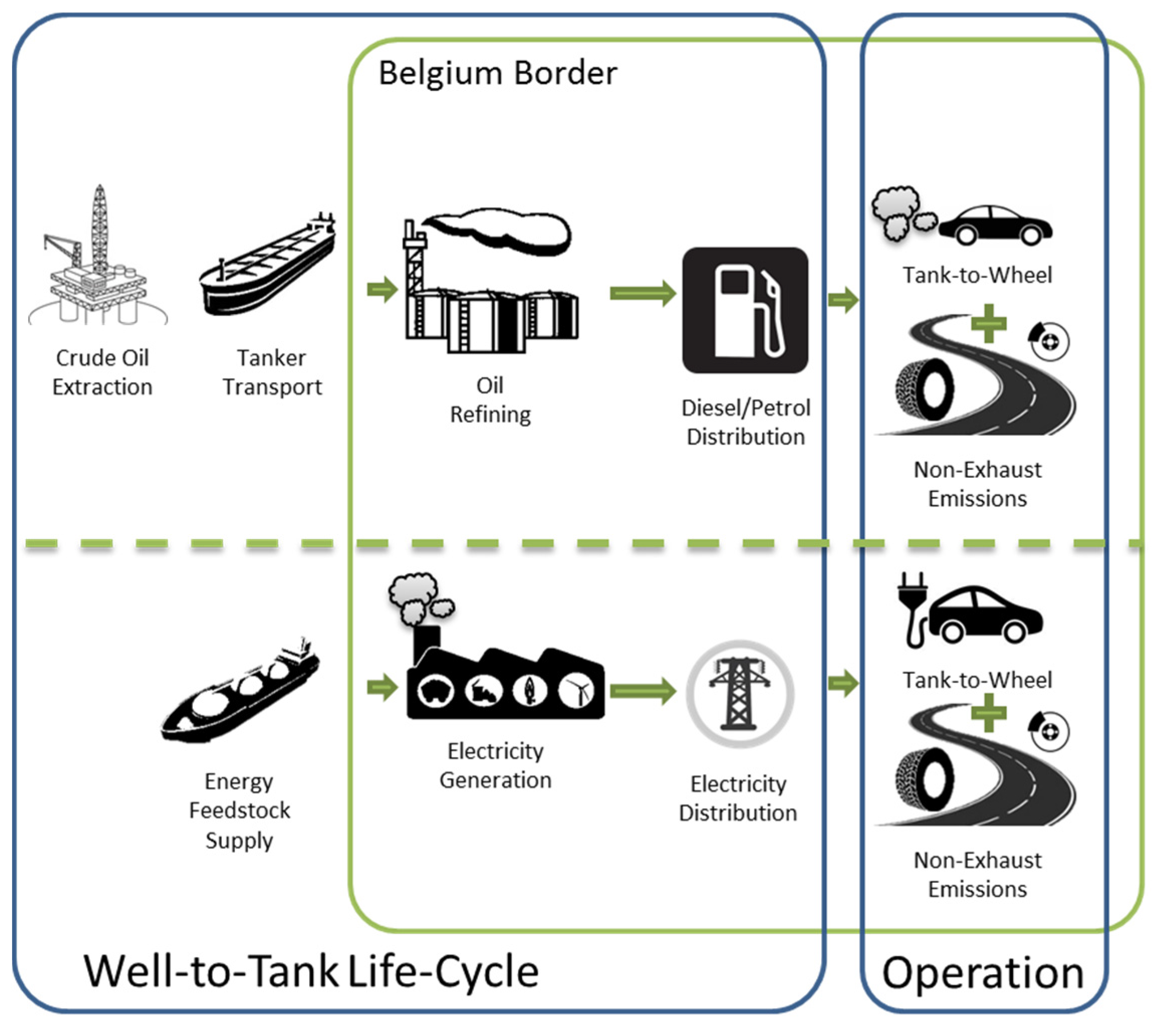 In this contribution, a method is proposed to assess the contribution of electric vehicles to urban air quality in Belgium, compared to conventional vehicles of the same weight class. Therefore, the effect on human toxicity (HT), photochemical ozone formation (POF) and particulate matter formation (PMF) was modelled. In addition, the disability adjusted life years (DALY) were simulated in order to assess the healthy years lost due to poor urban air quality. For this reason, the scope is not limited to the use phase of a vehicle, addressed in literature as the tank-to-wheel (TTW) phase. Instead, a negative well-to-wheel (WTW) as a partly life cycle analysis (LCA) was performed, within the Belgian borders. Therefore, the fuel refinery emission data from the Total refineries in Antwerp, as well as the Belgian electricity production mix from 2014 were used as input. Every other contribution in the life cycle of a vehicle except for these emissions created within the Belgian borders was excluded (e.g., mining abroad). The motivation is to have a clear view on which environmental impacts national policies can influence.