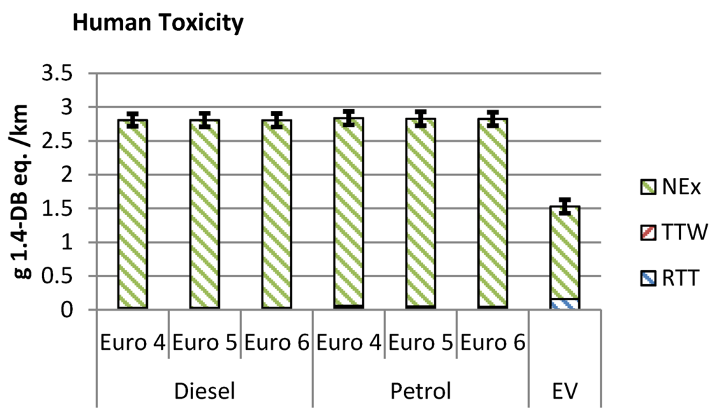 Regarding EVs, no tank-to-wheel emissions are present. Non-exhaust emissions however, are independent from powertrain choice. In EVs equipped with brake energy regeneration systems, the wear of brake pads can be reduced up to 66% [18,19]. This factor compensates for the increased average vehicle weight due the mass of the battery pack and its auxiliary systems (e.g., management systems, bus bars and power electronics).
