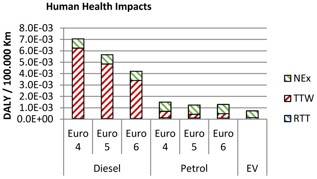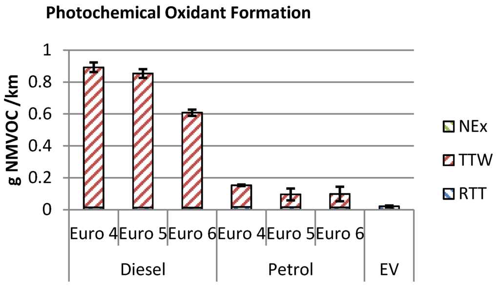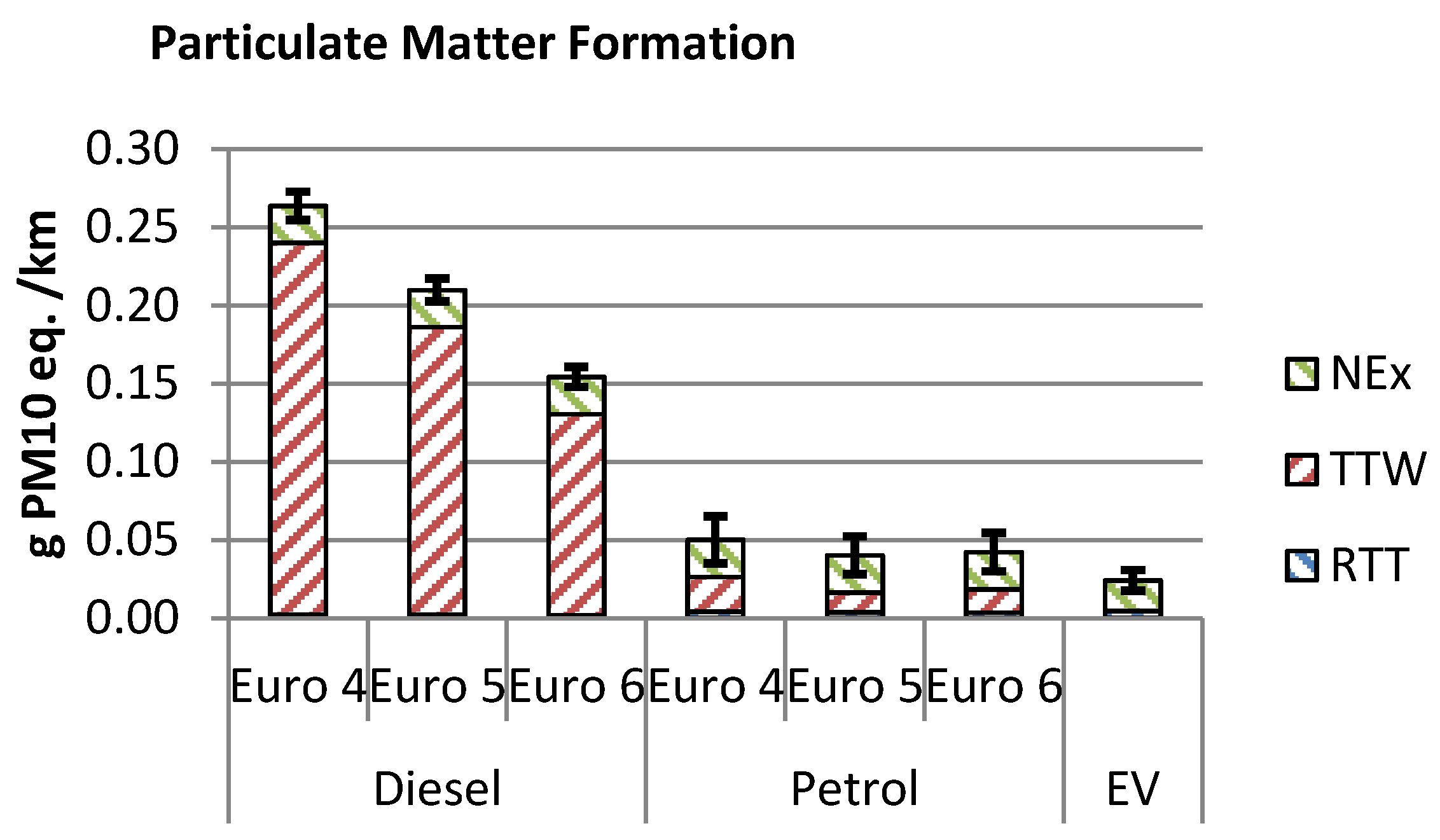 Atmospheric reactions will also add to the formation of secondary PM. For this reason, the emissions of NOx as well as of NMHC and ammonia (NH3) are of particular importance, as these pollutants are also known as secondary PM precursors [35]. In addition, the fuel sulphur content also acts as a precursor, for which it is assumed that all present sulphur in the fuel is oxidized to sulphates (SO42−), which will partially end up as particles. The share of SO42− is small however, as nowadays the European reference fuels have a maximum sulphur content of 10 parts per million (ppm). The shares of the PM-precursors that eventually end up as secondary PM and which were applied in this study, result from the ReCiPe methodology [36,37], as will be discussed further on in this paper.