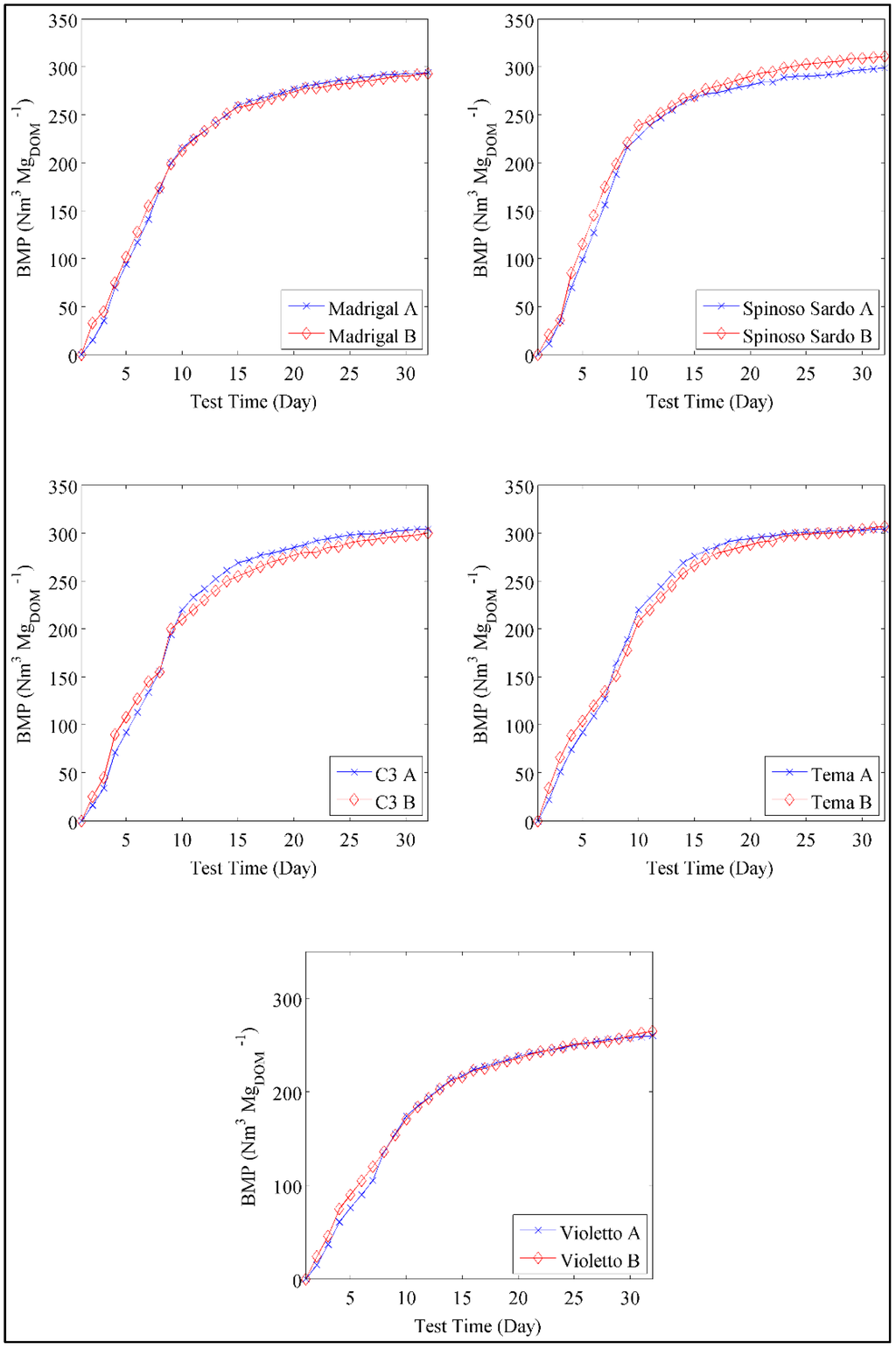 When comparing BMP results of the different cultivars (test condition A), it is possible to identify some basic features. First of all, C3 and Tema cultivars showed the highest value (304.0 Nm3·tDOM−1) but this difference was not statistically significant in comparison with Madrigal and Spinoso. Violetto had a significantly lower performance (259.9 Nm3·tDOM−1) than other cultivars. However, results are slightly different when BMP is referred to wet weight, as Spinoso is able to produce only 43.7 Nm3·t−1 due to its lower DOM content. For the same reason, C3 seems to be the most promising cultivar also on a wet weight basis, reaching 59.6 Nm3·t−1.