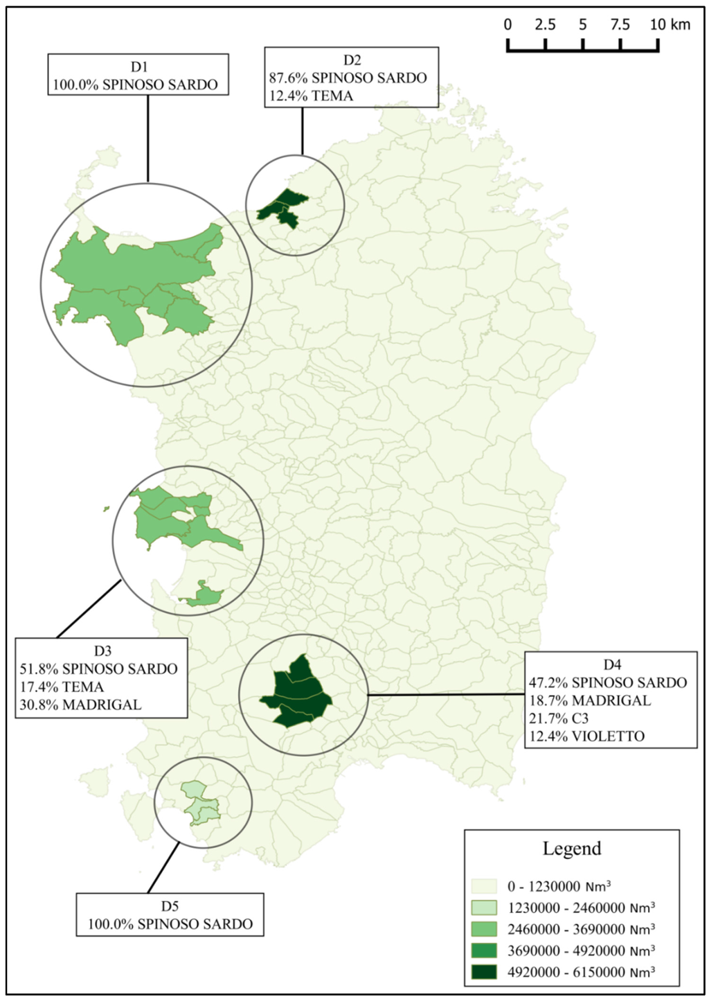 The theoretical biomethane potential from artichoke residues in the different districts is reported in Table 5, while Figure 2 geographically represents the districts with the respective cultivar contributions on biomethane potential. At the regional level, ca. 20 × 106 Nm3 CH4 could be produced, corresponding to 60% of current installed capacity, roughly 10 biogas plants with 1 MW of nominal power. D2 and D4, which have the largest amount of land under cultivation, could naturally be also important areas of feedstock supply for biogas plants. Combined, they might represent the 60% of the total regional potential, while another 18% could be sourced from D1. The current 1050 ha cultivated in D3 could then provide ca. 2.6 × 106 Nm3, while D5 would produce only 1.6 × 106 Nm3, which is ca. 8% of the total.