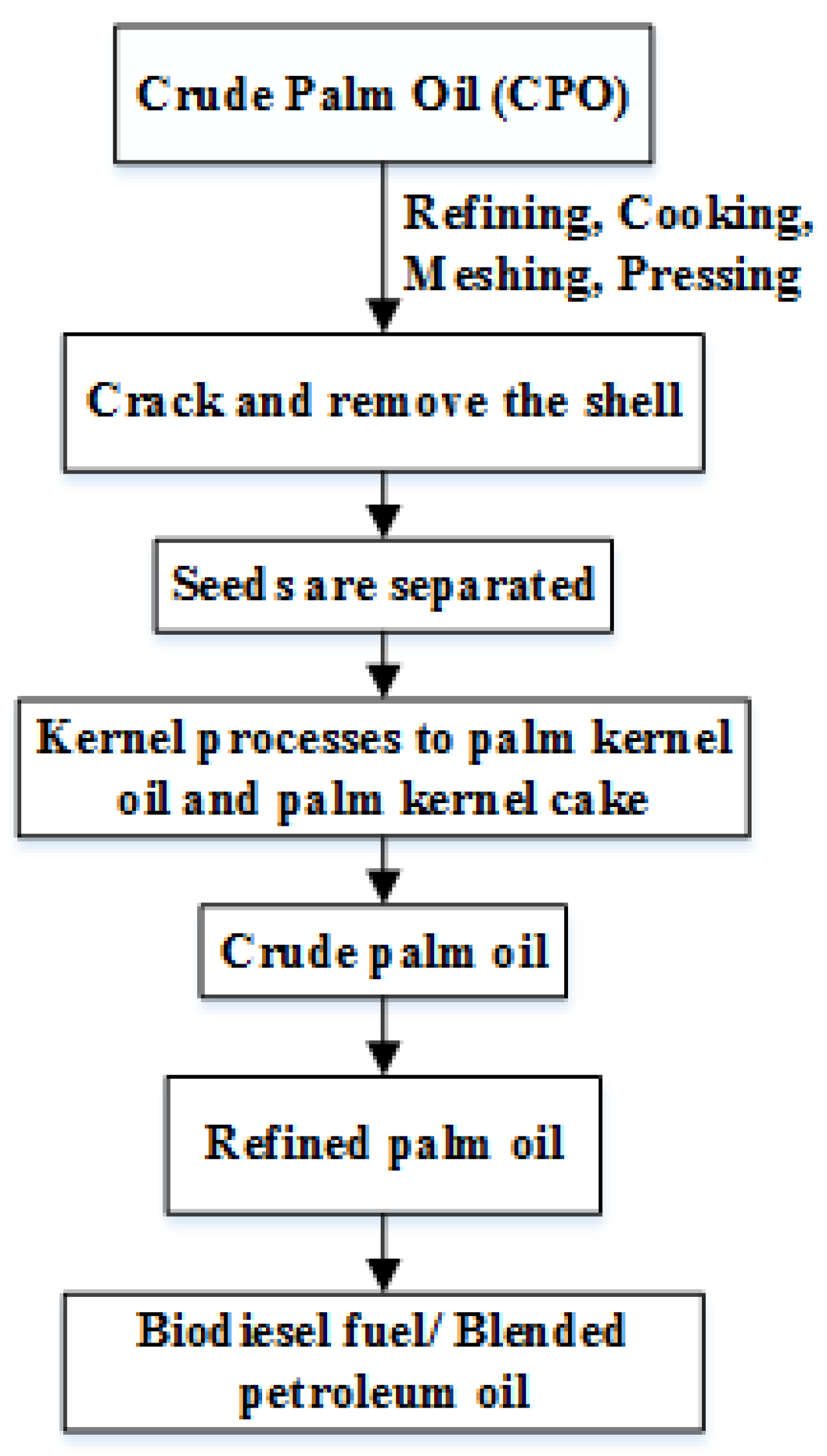 In recent years, global interest in biodiesel production and utilization has increased significantly due to the international energy crisis, global warming and climate change, as well as fossil fuel depletion [1]. Biodiesels, which are fatty acid methyl or ethyl esters made from biomass vegetable oils, are non-polluting fuels and a renewable energy source. Biodiesels are recognized as a viable substitutes for diesel fuel which can be produced with similar functional properties as fossil fuels from local feedstocks. A variety of feedstocks can be employed for biodiesel production like rapeseed, soybean, palm oil and jatropha [2]. Palm oil, as one of the main agricultural products in Malaysia, is mostly applied for biodiesel production in that region. Palm oil-based biofuel could generate a similar efficiency as diesel fuel with lower pollutant emissions, but with higher specific fuel consumption. Moreover, palm oil-based biofuel can be applied in compression ignition (diesel) engines without significant modifications. It also can be blended at any percentage level with petroleum diesel to create biodiesel blends [3]. Biodiesel can be produced from palm oil through a transesterification process, in which the triglycerides (free fatty acid and water contents) from palm oil react with an alcohol (ethanol or methanol) to form ethyl or methyl esters (biodiesel) and glycerol. The fleshy inner wall of the palm fruit called mesocarp is processed to obtain the palm oil. The step by step process of crude palm oil (CPO) and finally palm oil-based biodiesel production is illustrated in Figure 1. CPO is produced from the mesocarp through refining and kernel processing. Approximately 25%–28% of CPO can be produced from a palm bunch. CPO is processed into refined palm oil which can then be used for multiple applications, including palm oil biodiesel production. Palm oil is processed into CPO, then into refined oil before being processed into palm oil biodiesel. Palm oil biodiesel can be either be processed into an ester or blended in certain proportions with petroleum diesel [4].