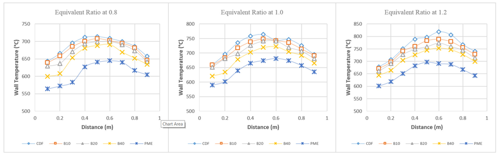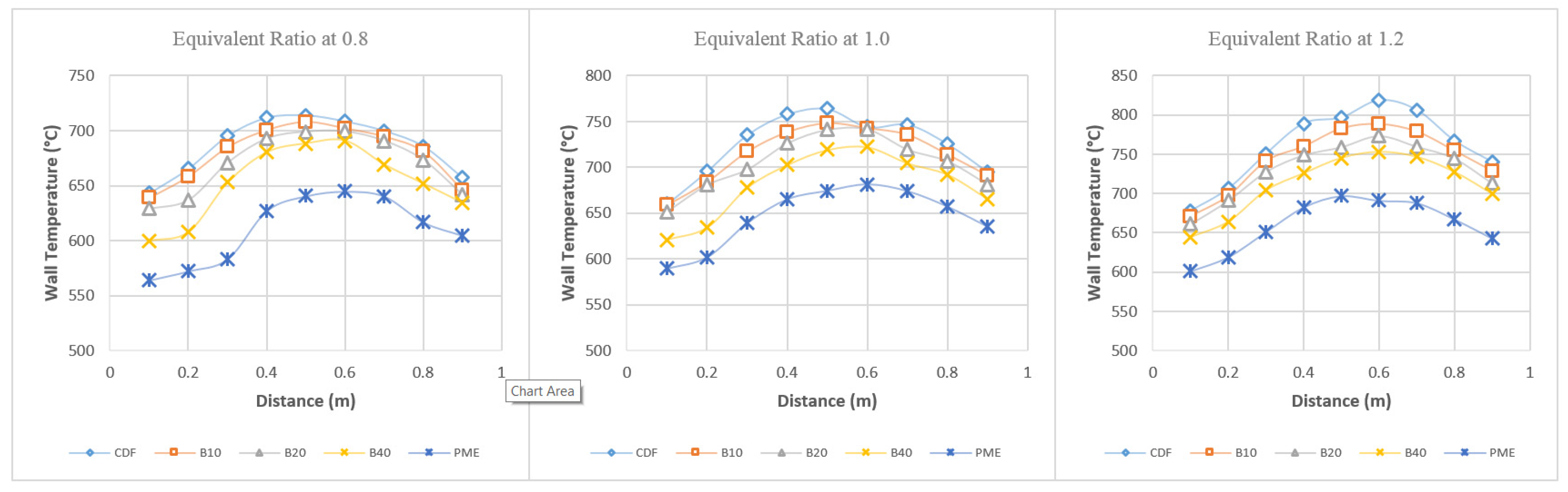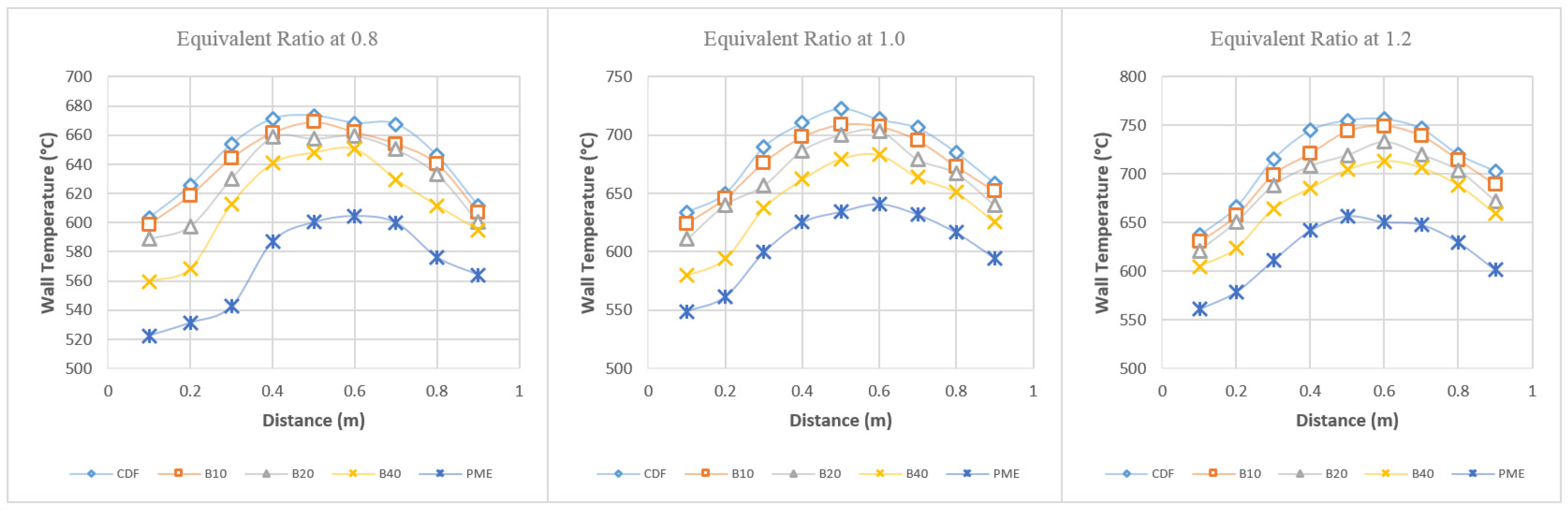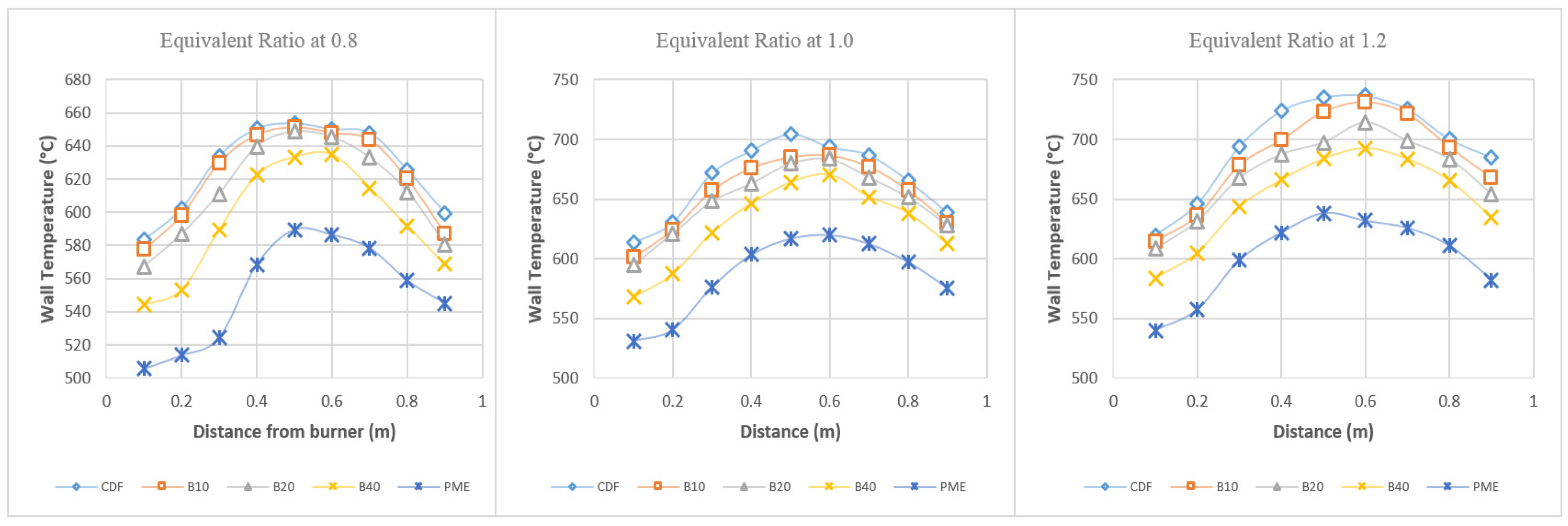 The wall temperature was measured using thermocouples (K-type) placed at nine points along the combustion chamber starting from the burner outlet until the end of the chamber (the distance between each point is 100 mm). Experimental results confirm that diesel fuel generated higher wall temperatures than palm oil-based biodiesel and its blends during the combustion tests. Under stoichiometric conditions, the combustion of CDF produced a maximum wall temperature value of 704.6 °C (with the 1.25 nozzle), 723 °C (1.50 nozzle) and 763.9 °C (1.75 nozzle), whereas, PME produced a maximum wall temperature value of 620 °C (1.25 nozzle), 641.1 °C (1.50 nozzle) and 681.3 °C (1.75 nozzle). These peak temperatures occur at the middle distance of the combustor due to the high heat intensity at that point.