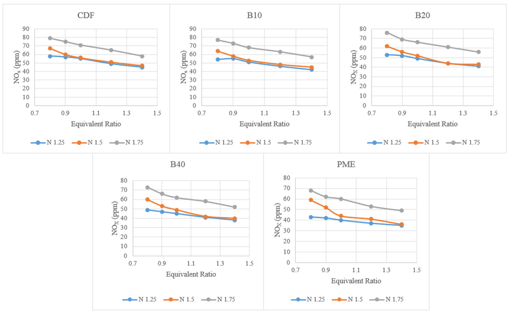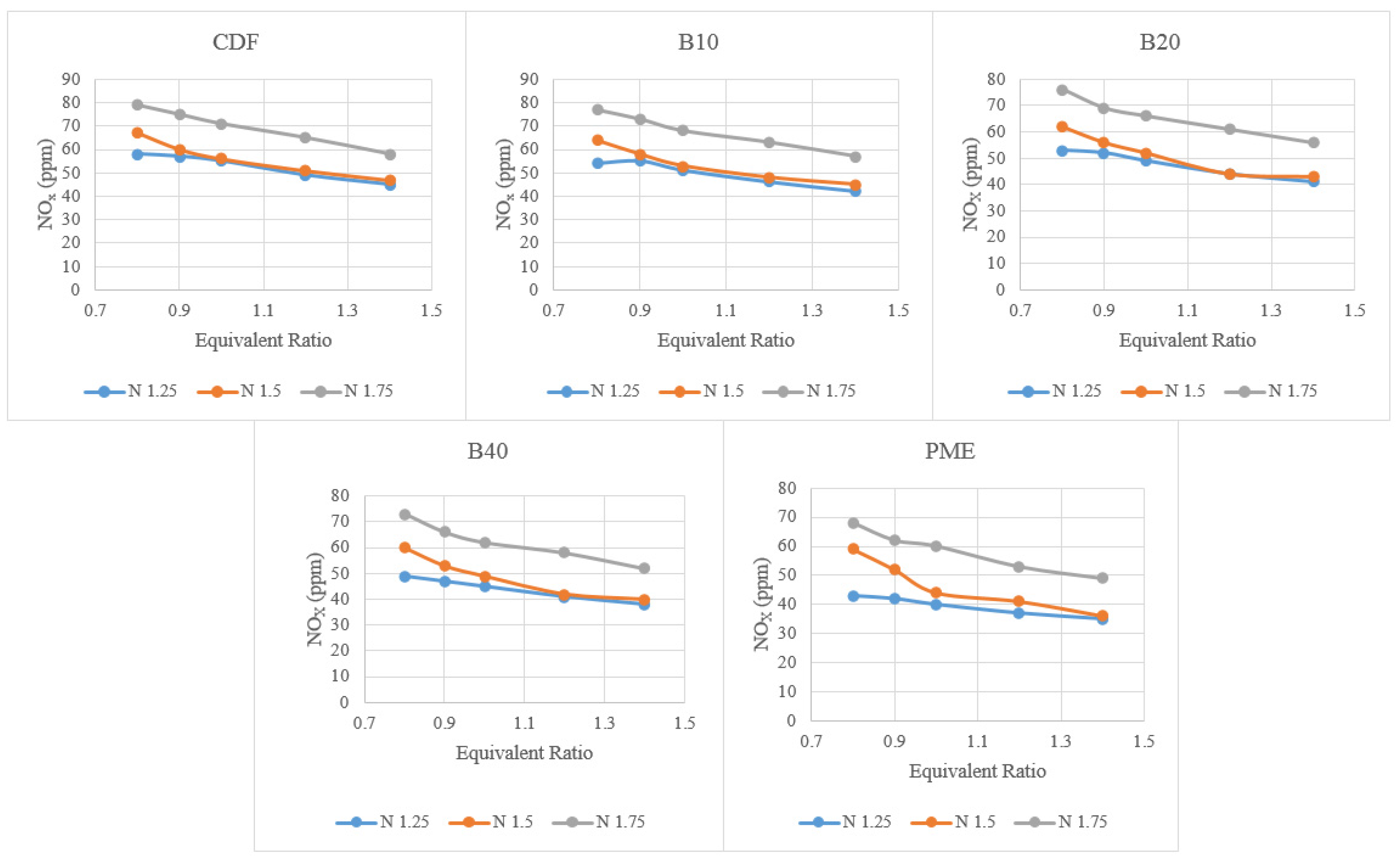 The rate of nitrogen oxide (NOx) formation in biodiesel combustion has become a controversial topic. NOx formation increases in a combustion process as the excess air and the temperature increase. Some reports indicate that NOx formation in biodiesel combustion is reduced compared to diesel combustion [18]. However, a rise in NOx formation in biodiesel combustion [17] as well as similarity of NOx formation in biodiesel and diesel combustion [19] have been reported too. These various results are due to the different experimental setups used, different biodiesel content, engine type and operating systems. Figure 7 depicts the emission rate of NOx for each fuel tested at different equivalence ratios and different volumetric fuel flow rates.