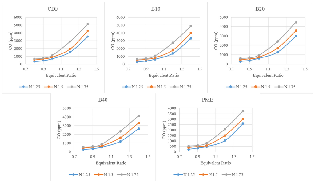 Based on the previous reports, it was expected that the rate of CO formation would be lower in biodiesel combustion due to the higher oxygen and lower rate of carbon to hydrogen in biodiesel compared to diesel [20]. Figure 8 displays the CO emissions for each tested fuel at different equivalence ratios and different volumetric fuel flow rates. There was about 8%, 11%, 23% and 30% reduction in CO emissions for B10, B20, B40 and PME, respectively, compared to CDF under stoichiometric circumstanced and a volume fuel flow rate of 1.25 USgal/h.