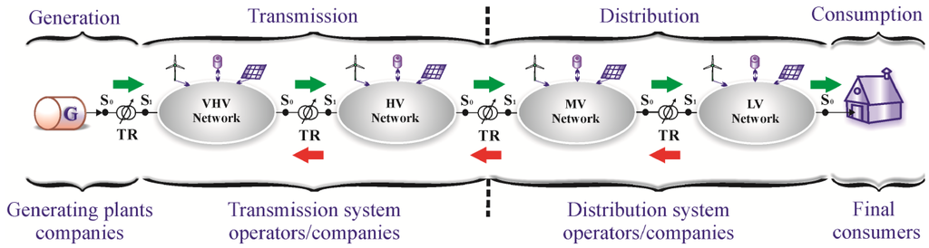 In summary, the issue of metering bidirectional power [26] due to possible reverse active and reactive power flows [27,28,29,30] in a transformer (TR) [31] which is typically used to connect different voltage levels in power systems, as seen in Figure 1, is of high interest and major importance for the society of power and energy systems. This represents a combined technical and economical complex problem, and, therefore, more studies are required in this area. The main contributions of this work are summarized as follows: