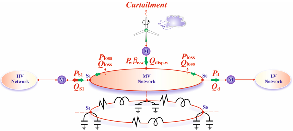 In order to show the contribution of WSs as the sole reactive power source in the MV network, no BSS is considered in this paper in comparison to [2]. More precisely, the MV network depicted in Figure 2 includes, as mathematically formulated in Equations (16) and (17), demand (Pd, Qd), WS (Pw, Qdisp.w) and slack bus S1 (PS1, QS1).