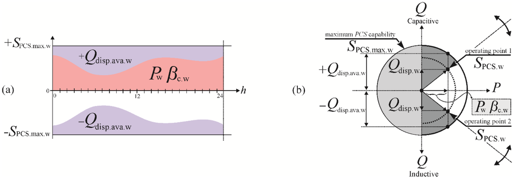 Generally, the capability of a power conditioning system (PCS) used for connecting DG units to a power system depends on DG technologies, e.g., see [21]. In this paper, a full-scale power electronic converter [22] is modeled as an ideal PCS as seen in Figure 3. Furthermore, we incorporate a curtailment factor βc.w (see the nomenclature in Appendix 1) to ensure feasible solutions of the A-R-OPF as defined in [15] and [19]. The relationships between the active Pw and reactive Qdisp.w power in this model are simply explained using Figure 3 and expressed as: