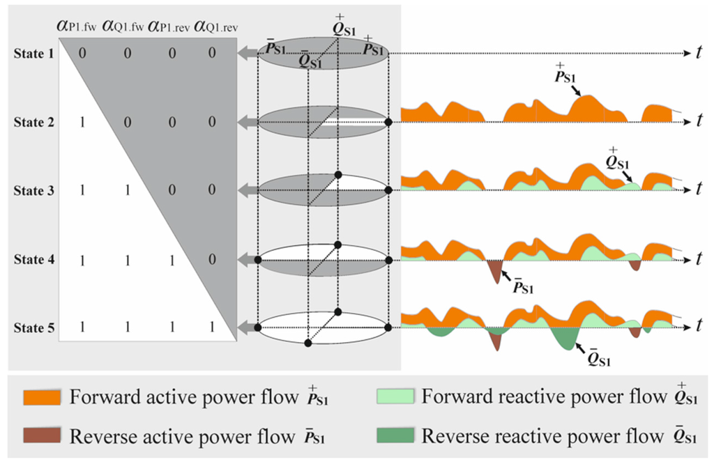 The operating state can be denoted by the values of the four decision variables. For example, the state (1, 1, variable, 0) means (αP1.fw = 1, αQ1.fw = 1, αP1.rev = variable, αQ1.rev = 0).