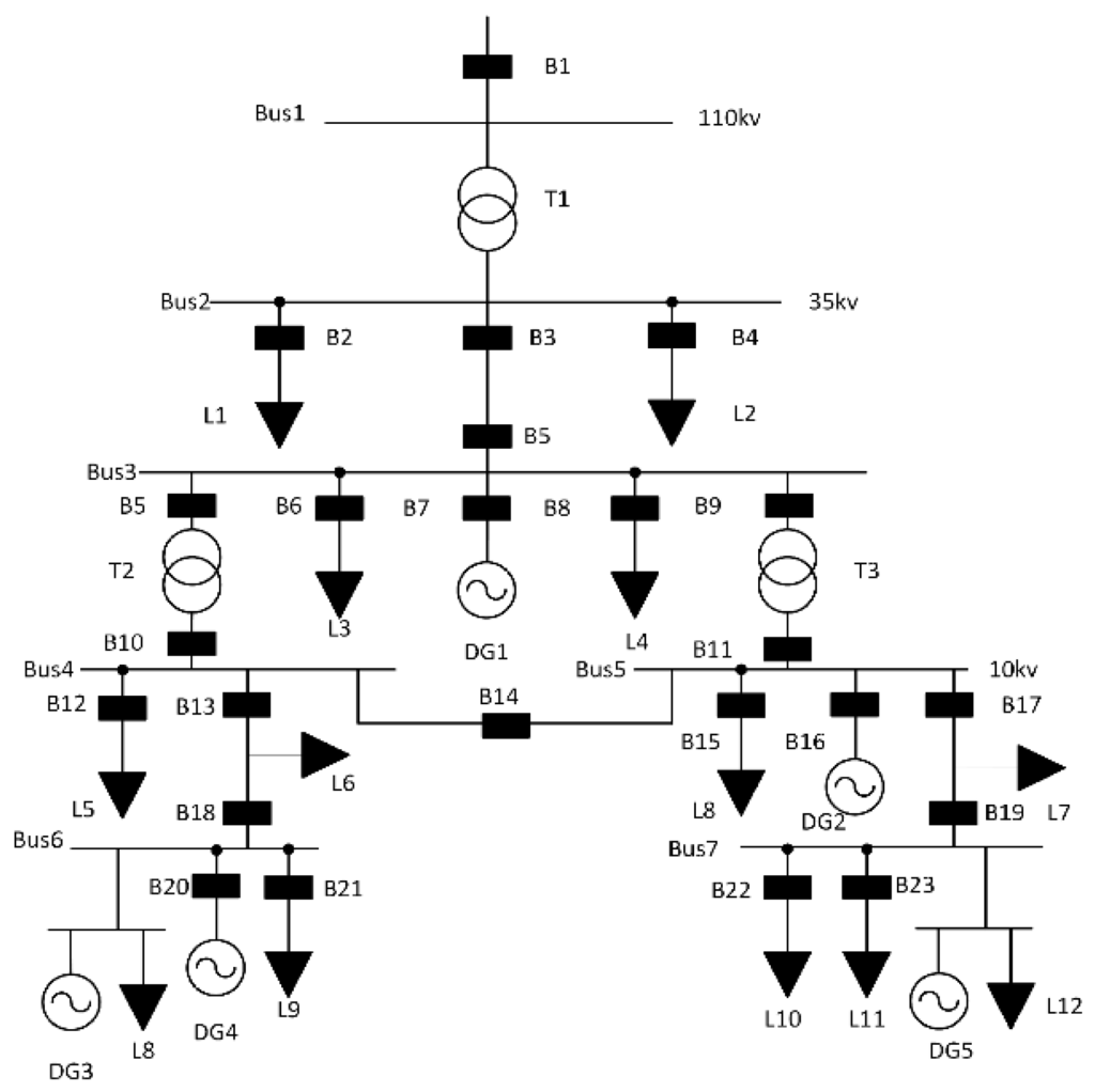 In consideration of distribution network configuration, the maximum capacity of DG, load grade and size, intentional islanding makes an islanding scheme and determines a reasonable island area in advance [,]. When a fault happens at the upper transmission system, the island still can serve partial or full loads according to the pre-determined scheme [,].