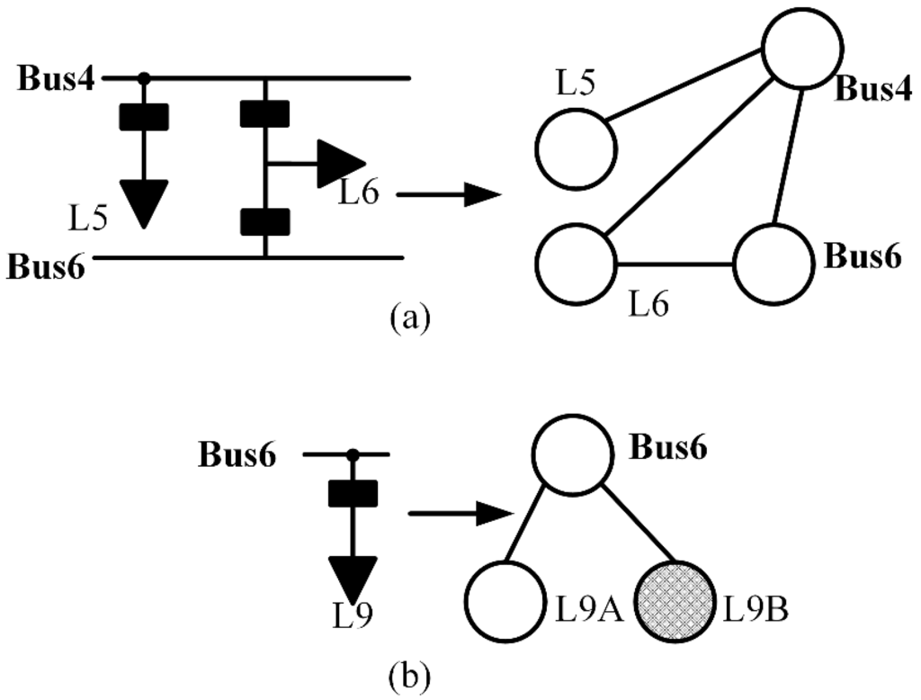 The traditional connected graph of a distribution network generally considers load directly connected to the bus and ignores the load node located at the branch between two buses. In Figure 3a, the load L5 directly connects to the bus node Bus4, so the load node and the bus node constitute an edge. The load node located at the branch and two bus nodes at both sides of the branch constitute triangle edges, such as L6, Bus4 and Bus6 in Figure 3a. The triangle provides more path choices for the island scheme to increase the flexibility of intentional islanding.