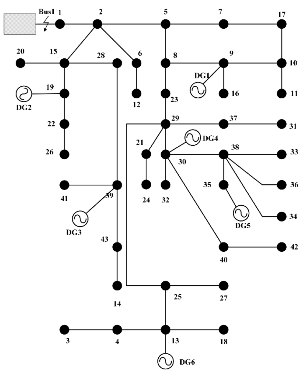 As shown in Figure 4, the case employs an improved IEEE 43-bus system integrated with five DGs. The specific parameters of the line can be queried in reference [], and the customized parameters of DG and load are listed in Table 1 and Table 2. The test system adopts reactive local compensation, so it does not concern reactive power and ignores the reactive power parameters of load and DG.