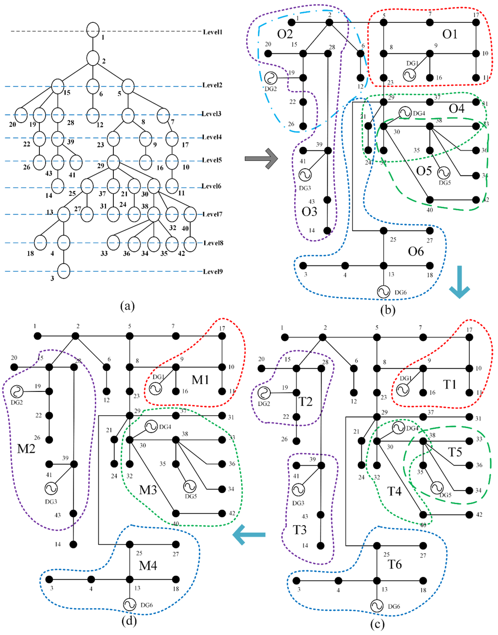 The rest of the paper is arranged as follows. Section 2 introduces a layered directed tree model to express the distribution network and defines the weight of the nodes and edges. The object functions, constrained conditions and partitioning algorithm of the islanding scheme are given in Section 3. In Section 4, the method and comparative algorithms are applied to the improved IEEE 43-bus system to demonstrate the method’s validation. Section 5 provides some concluding remarks.