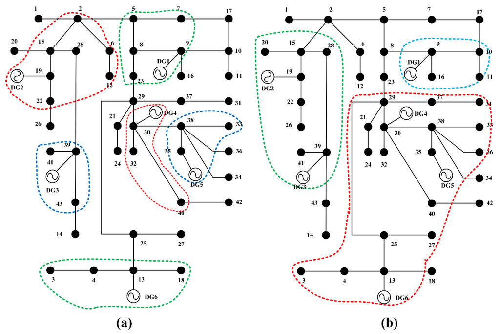 Figure 6b illustrates the island partition scheme formed by the partition model based on the tree knapsack problem []. The method takes load priority grade into consideration, which ensures essential power loads have the highest priority of being restored, so all the first grade loads and second grade loads are completely restored in the scheme. However, the total restored load is 414 kW, which is less than the 443.19 kW that is restored by the scheme proposed in this paper. In order to save computation time, the method normalizes load demand and DG capacity to be integers. In this case, 10 kW is defined as base power, the 25 kW power at node 4 is rounded to 3, which is supposed to be 2.5. The 75 kW at DG5 and DG6 are rounded to 7, and they are supposed to be 7.5. The two examples show normalized integer results will inevitably enlarge load demand and shrink DG capacity, so the island algorithm in [] would cause load loss, such as the load at nodes 9, 43, 18 and 33 which are supposed to be divided into island. In addition, the island combination in the method ignores network loss, with the merged island including DG4–DG6 producing more network loss. The total network loss is 5.13 kW, which is larger than the 3.47 kW loss of the island scheme proposed in this paper. Due to the lower level, the load at nodes 24 and 31 should have priority to be restored after the fault is cleared, but the method divides the two loads into the island. The loads at nodes 34 and 42 with higher levels are outside the island, which extends the power recovery time. The loads at nodes 14 and 43 also face the situation. The total load that cannot be directly restored after the fault is cleared is 65 kW, which is more than the 15 kW by the method proposed in this paper.