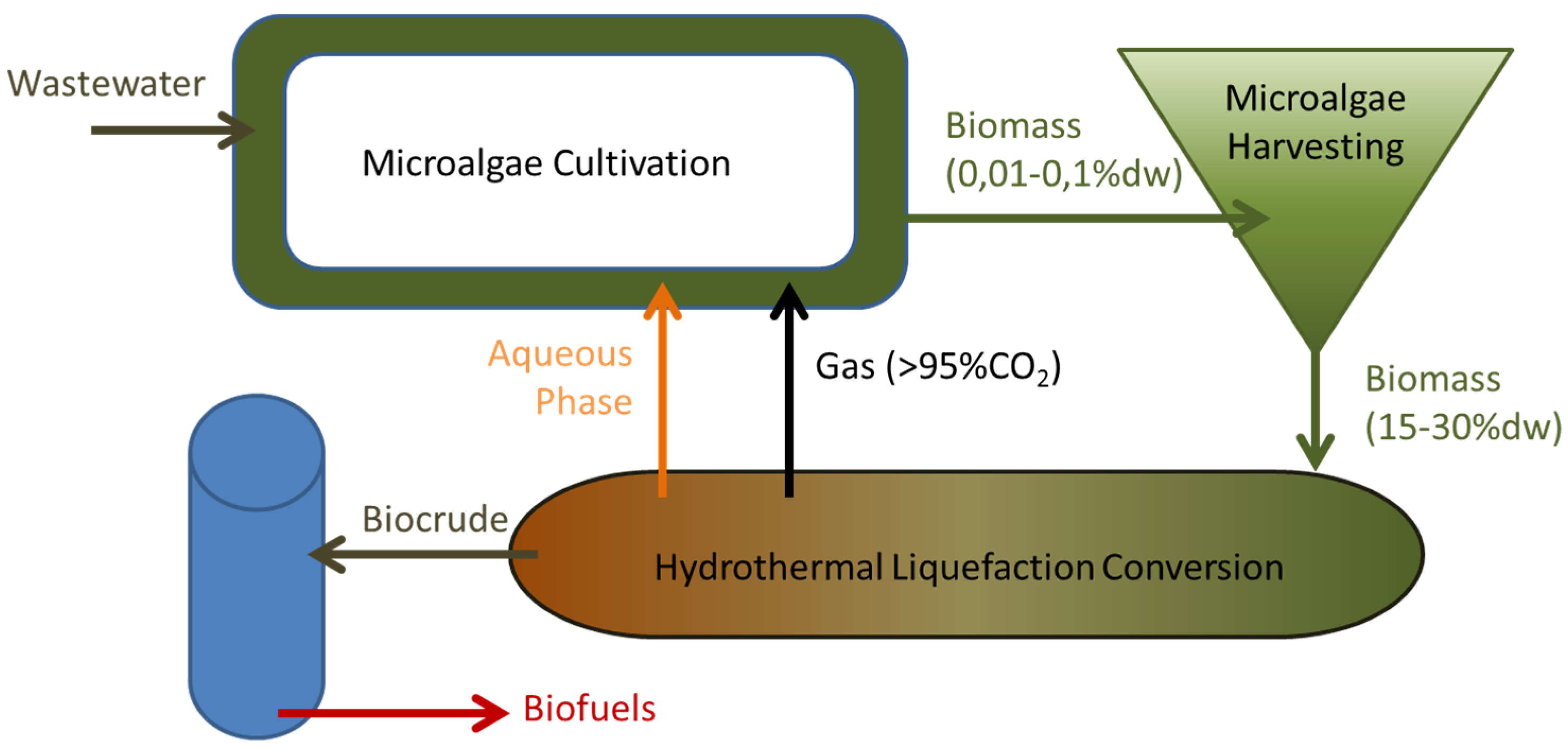 Direct wet conversion processes of the whole biomass such as anaerobic digestion or hydrothermal liquefaction (HTL) are therefore more adapted. Anaerobic digestion is the conversion of a biomass through dark fermentation into a biogas. It is efficient on microalgae with theoretical yields between 260 and 414 mL of CH4/g of volatile solids [96]. Unfortunately, the economic value of biogas is too low at present (at most 1.33 €/Nm3 of CH4 using the highest electricity buy-back rate of Electricité de France). Nowadays, anaerobic digestion is not an economically profitable solution for microalgae biomass valorization. HTL is a thermochemical process which converts wet biomass into a biocrude (heavy oil, yields between 20 and 87% [97]), gas (>95% of CO2 that can be recycled to the cultivation step [98]), some residual solids and an aqueous phase that contains large amount of nutrients. The potential to recycle the aqueous phase has been studied in order to reduce the cultivation costs and increase the overall sustainability of the process [98,99,100]. Growth can be inhibited at first but after an adaptation period, higher biomass productivities have been observed probably due to mixotrophic growth [98,99]. The biocrude can be directly burned in a boiler or upgraded through hydrotreating into a biofuel (a mix of naphta, gasoline and jetfuel [68]). HTL converts the whole biomass, therefore, there is no need for a monoclonal, monospecies, high l ipid-producing microalgae in comparison to the lipid extraction and conversion pathway. The HTL biomass conversion process is agnostic to the type of feed and hence, broadens the range of biomass and mixtures of organic material (including the activated sludge (bacteria) and algal biomass, as well as zooplankton generated from wastewater treatment) that can be used. The concept is represented on Figure 2. Additionally, HTL pathways are getting closer to economic viability with estimated biofuel production cost around 2.5 €/L of biofuel [101].