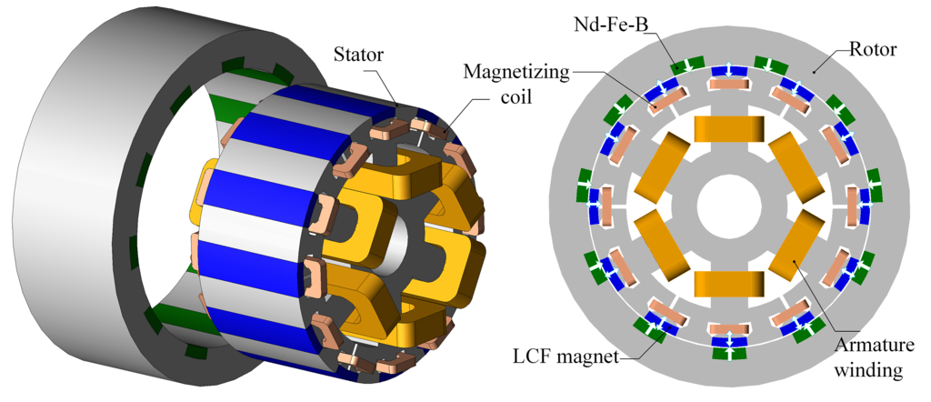 Figure 1 illustrates the configuration of the proposed DCP-VMM, which is characterized by a combination of two individual VMs featuring magnets on the rotating and stationary sides, respectively. The machine comprises only one external rotor and one multi-tooth inner stator, which facilitates in-wheel driving application to EVs, and hence the mechanical manufacturability as well as space utilization ratio are improved. The NdFeB magnets are mounted on the external rotor, which function as a main contributor to the main air-gap flux. The radially magnetized LCF PMs are alternately buried in air space between adjacent modulating iron poles, and the magnetizing coils are wound beneath the LCF magnet poles, which empowers current pulsation to enable the magnetization state variations of the corresponding LCF magnets.