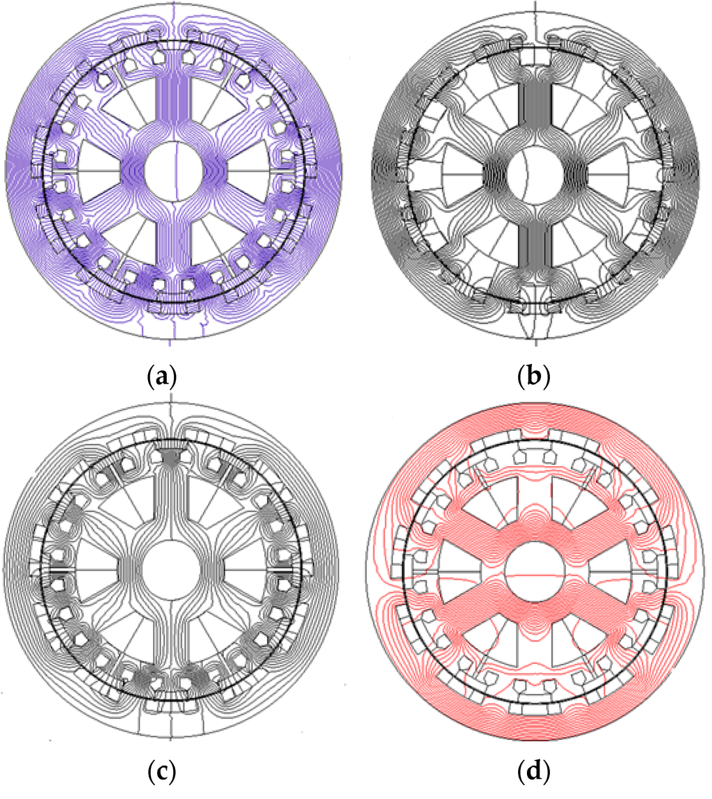 Field distributions excited by (a) hybrid PMs; (b) rotor-PM; (c) stator-PM; (d) armature reaction.