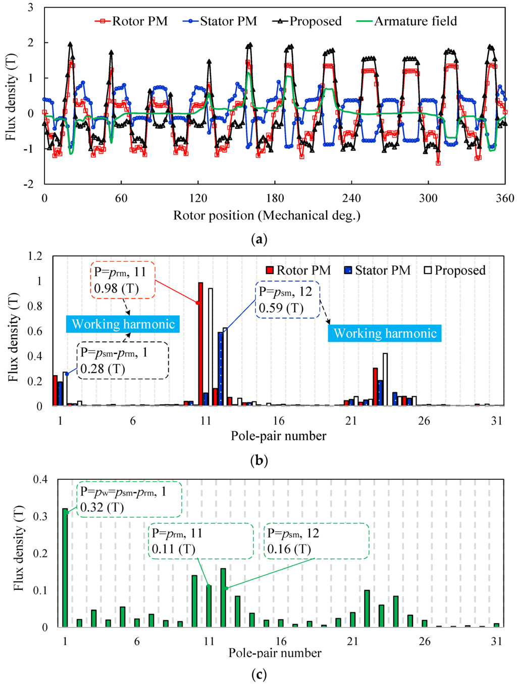 Air-gap flux density waveforms and harmonic spectra contributed by (a) PMs; (b) armature reaction; (c) Harmonic spectra.