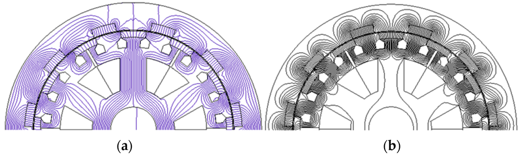 Field distributions of DCP-VMM subjected to different magnetization states. (a) Flux-enhanced; (b) Flux-weakened.