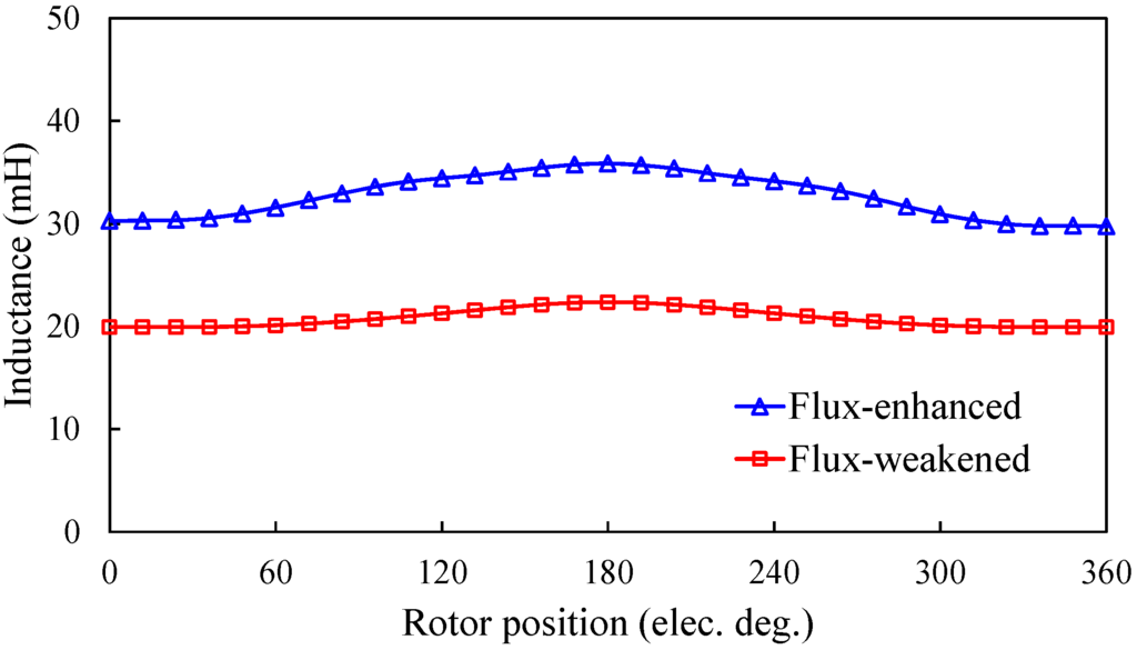 where Ψm is the flux-linkage of the magnetizing coil due to magnets and field current, Ψm0 is the flux-linkage of the magnetizing coil due to magnets only. Obviously, some negligible fluctuations in the inductance profile can be observed, which implies that the circulating permeance for transient magnetizing or demagnetizing fields uniformly varies with the rotor position.