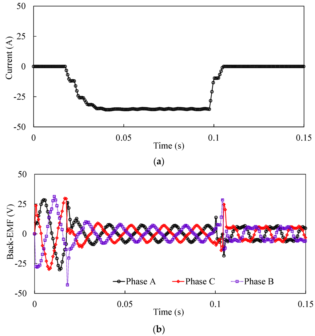 That is to say, the flux control is less dependent on the rotor position, thus the validity of the DC magnetizing coils for online magnetization control is confirmed. Furthermore, the transient response of open-circuit back-EMF to a demagnetizing current pulse of −35 A is plotted in Figure 8. It demonstrates that the flux-adjustability can be easily achieved by a current pulse.