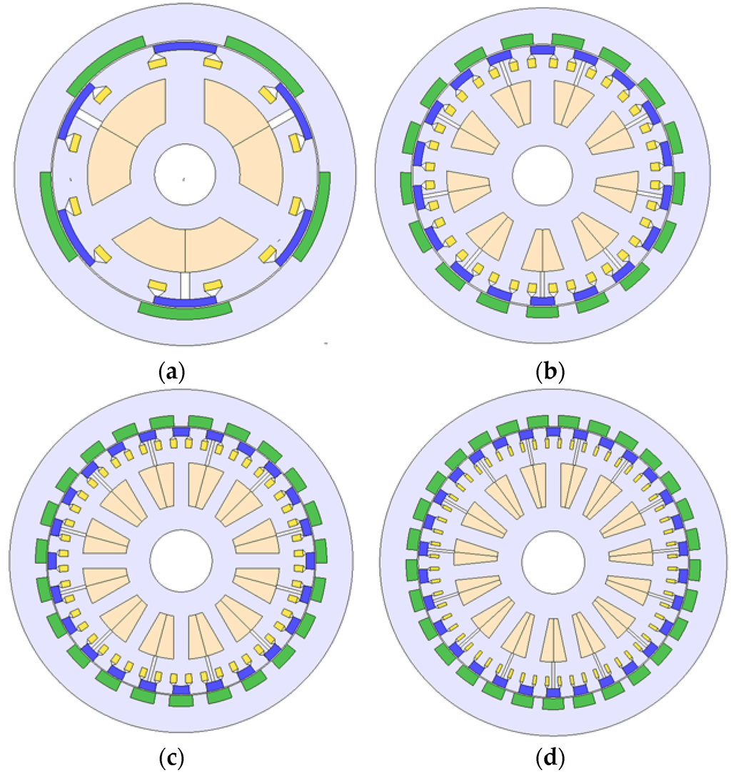 DCP-VMM structures having alternate stator/rotor pole number combinations. (a) 3-slot/10-pole; (b) 9-slot/34-pole; (c) 12-slot/46-pole; (d) 15-slot/58-pole.