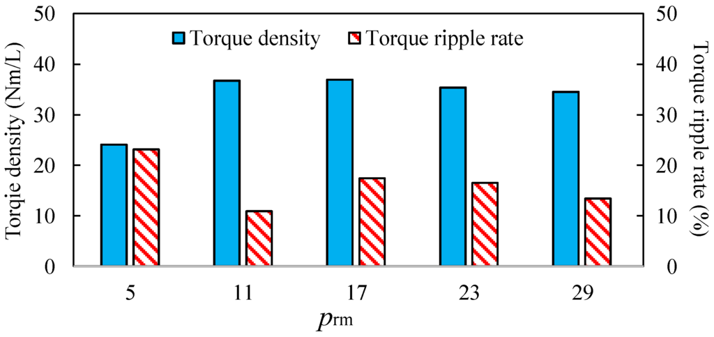 Since various combinations of the stator and rotor pole numbers are available for the proposed DCP-VMM, the preliminary design work involves selecting the most feasible psm/prm for improving torque quality, etc. This paper focuses on the VM groups with pw1 = 1, which appear to show higher torque densities [,]. As the armature slot number is fixed at 6 in this case, the possible prm is 5, 11, 17, 23, and 29, etc. The machine configurations having alternate stator/rotor combinations (prm = 5, 17, 23, and 29) are shown in Figure 9. Commonly, each stator pole is split into two iron poles, and LCF PMs are alternatively embedded between the adjacent iron poles. The torque density and torque ripple rate (defined as the peak-to-peak torque ripple to the average torque) at the flux-enhanced state are calculated as shown in Figure 10. It can be observed that the proposed machine having prm = 11 exhibits favorable torque performance, which will be chosen for further analysis.