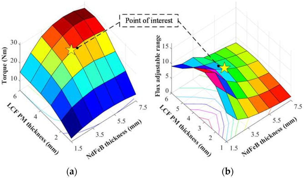 The influences of the radial thicknesses of NdFeB and LCF PMs on torque capability and flux adjustable range, defined as the ratio of the fundamental back-EMF magnitudes at flux-enhanced and weakened states, are calculated as shown in Figure 11. The optimal NdFeB and LCF thicknesses can be obtained, i.e., 4.5 mm and 4 mm, which satisfactorily realizes the tradeoff between torque enhancement and speed range extension.