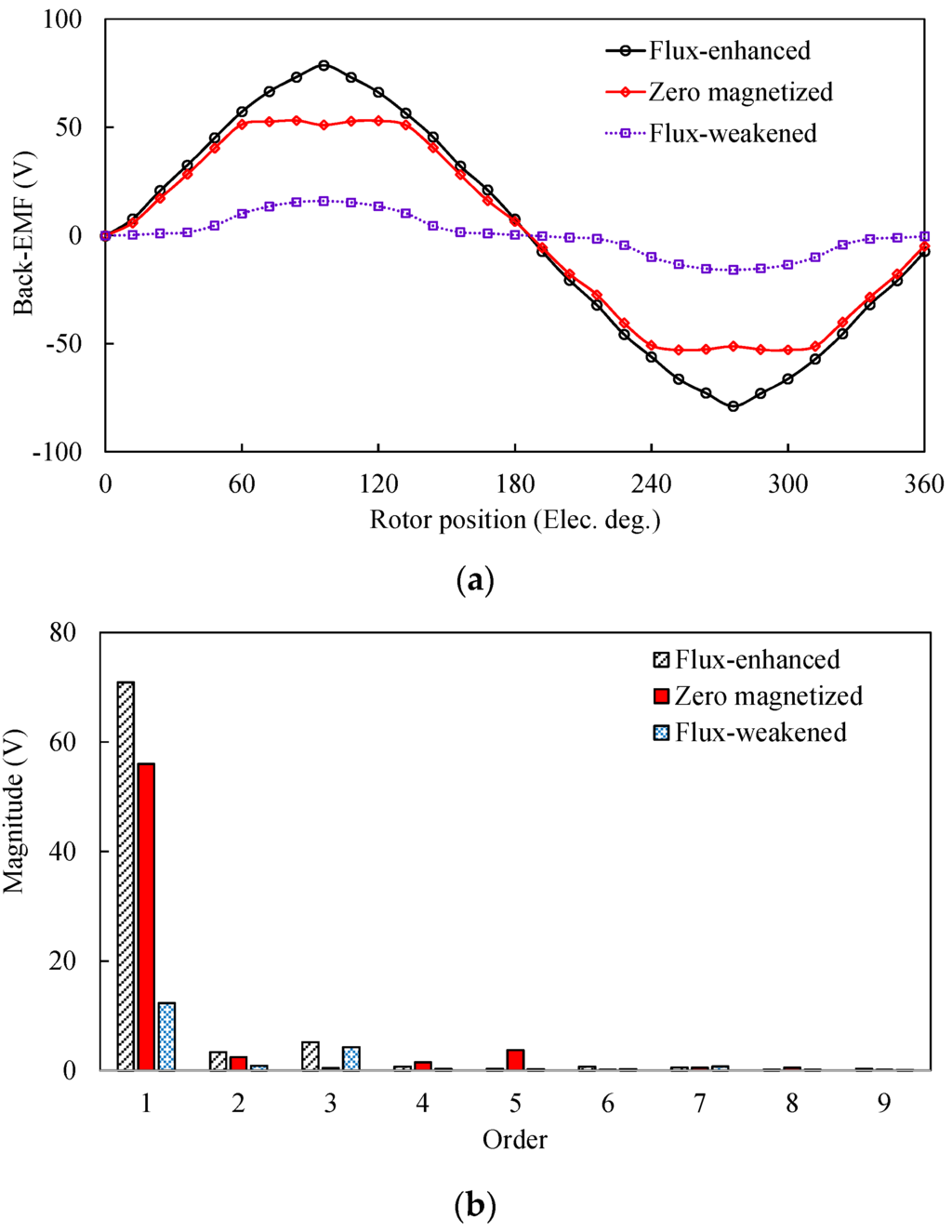 The electromagnetic performance of the proposed DCP-VMM is analyzed by a coupled solution []. JMAG 14.0 software package is utilized for FEM analysis. The “Shared Memory Multiprocessing (SMP)” with eight degrees of parallelism is employed in the solver. For the nonlinear calculation, the “Newton-Raphson” method with maximum nonlinear iterations of 50 and convergence tolerance of 0.001 is adopted, which has been proven to work very well to deal with the nonlinearity of B-H curve of magnetic material in large number of calculation examples. For the mesh setting, the option of “slide motion mesh” is adopted to improve the accuracy of calculation by adjusting the element size in the gap at each step. The optimized design parameters are tabulated in Table 1. Figure 12 shows the open-circuit back-EMF waveforms and harmonic spectra at different magnetization states of LCF magnets (300 r/min). It demonstrates that the back-EMF can be flexibly adjusted by changing the magnetization levels and polarities of LCF PMs, which benefits the wide-speed range applications. Besides, it can be observed that the flux-weakened effect appears to be more obvious than the flux-enhanced one, which is mainly attributed to the significant magnetic saturation at the flux-enhanced state, and hence the magnetic reluctance for armature field circulating is increased. The highest total harmonic distortion (THD) occurs at the flux-weakened state, which can be reflected in Figure 12b.