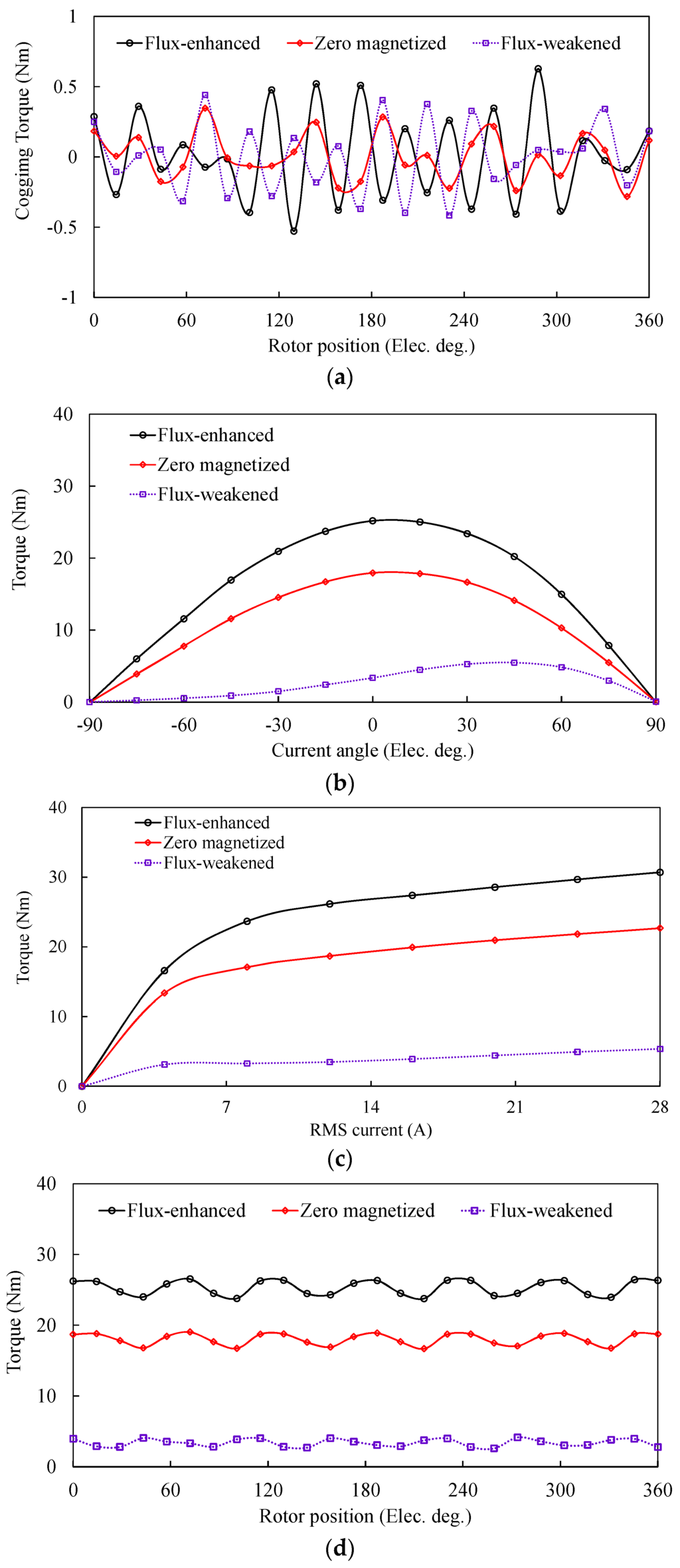 The torque characteristics under different magnetization states are evaluated as shown in Figure 13. The highest torque ripple of 46.3% can be found at the flux-weakened state, while the torque ripples only account for 10.9% and 13.1% of the average torque for the other two states. The high THD of back-EMF and high ratio of peak-to-peak cogging to the average torque, as well as reluctance torque ripple at the flux-weakened state are responsible for the torque ripple. It should be noted that the current angle advance control can be adopted when the machine operates at the flux-weakened state owing to the positive saliency ratio >“1”.