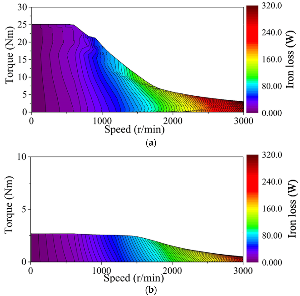 Iron loss maps. (a) Flux-enhanced; (b) Flux-weakened, DC link voltage = 216 V, rated RMS current = 10 A.
