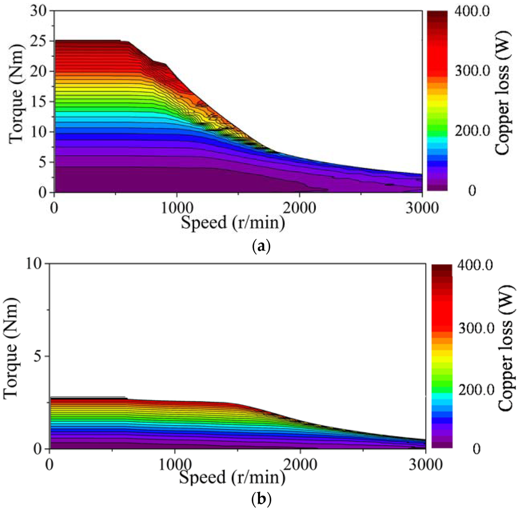 Copper loss maps. (a) Flux-enhanced; (b) Flux-weakened, DC link voltage = 216 V, rated RMS current = 10 A.