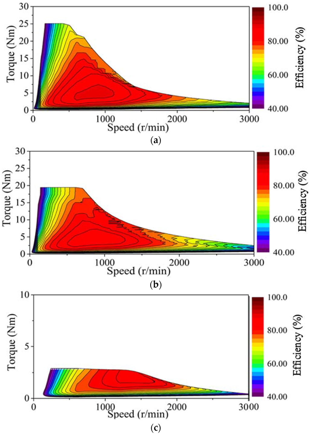 The iron and copper loss distributions within a whole operating envelop at different magnetization states are shown in Figure 14 and Figure 15, respectively. It can be observed that the iron loss, particularly in the high-speed region, can be significantly reduced via the flux-weakened control, which appears to be a dominant loss component in high-speed operation. This is mainly attributed to the field weakening effect due to the massively short-circuiting PM fluxes. This merit results in the flux-weakening performance improvement, as can be well reflected in Figure 16c. Figure 16 shows the efficiency maps of the proposed DCP-VMM. It should be noted that due to the relatively low power factor (0.63) at rated condition, the inverter capacity is inevitably increased with high voltage rating. In this case, the maximum applied voltage (124.7 V) and control strategy (maximum-torque-per-ampere) are employed in the calculation of the torque-speed curves. It can be observed that the optimal operating regions varies with different magnetization states, viz., the high efficiency improvement within a wide range of operating envelop can be obtained by combining the magnetization states at speed and loads.