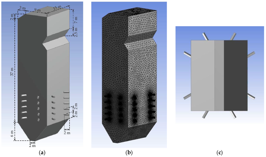 Figure 2 shows a schematic view of the combustor used in this study, including its dimensions and the layout of the meshing and feeding inlets in cross section. The feed inlet was a coaxial dual tube in which the fuel was fed through the inner tube. The combustor was based on those of existing 300 MWe coal-fired power plants. The combustor had a height, width, and breadth of 45 m, 12 m, and 15 m, respectively. Commercial CFD software was used to create the simulation. ANSYS Design Modeler was used to build the combustor model in 3D, and ANSYS Fluent version 16.2 (ANSYS Inc., Concord, MA, USA) was used to analyze the co-firing behavior. The co-firing simulation took account of governing equations (mass, momentum, and enthalpy), turbulence, radiative heat transfer, and reactions in both the particle and gas phases.