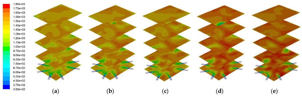 Cross-sectional temperature distribution profile across the combustor: (a) 0% PKS; (b) 10% PKS; (c) 15% PKS; (d) 25% PKS; and (e) 50% PKS.